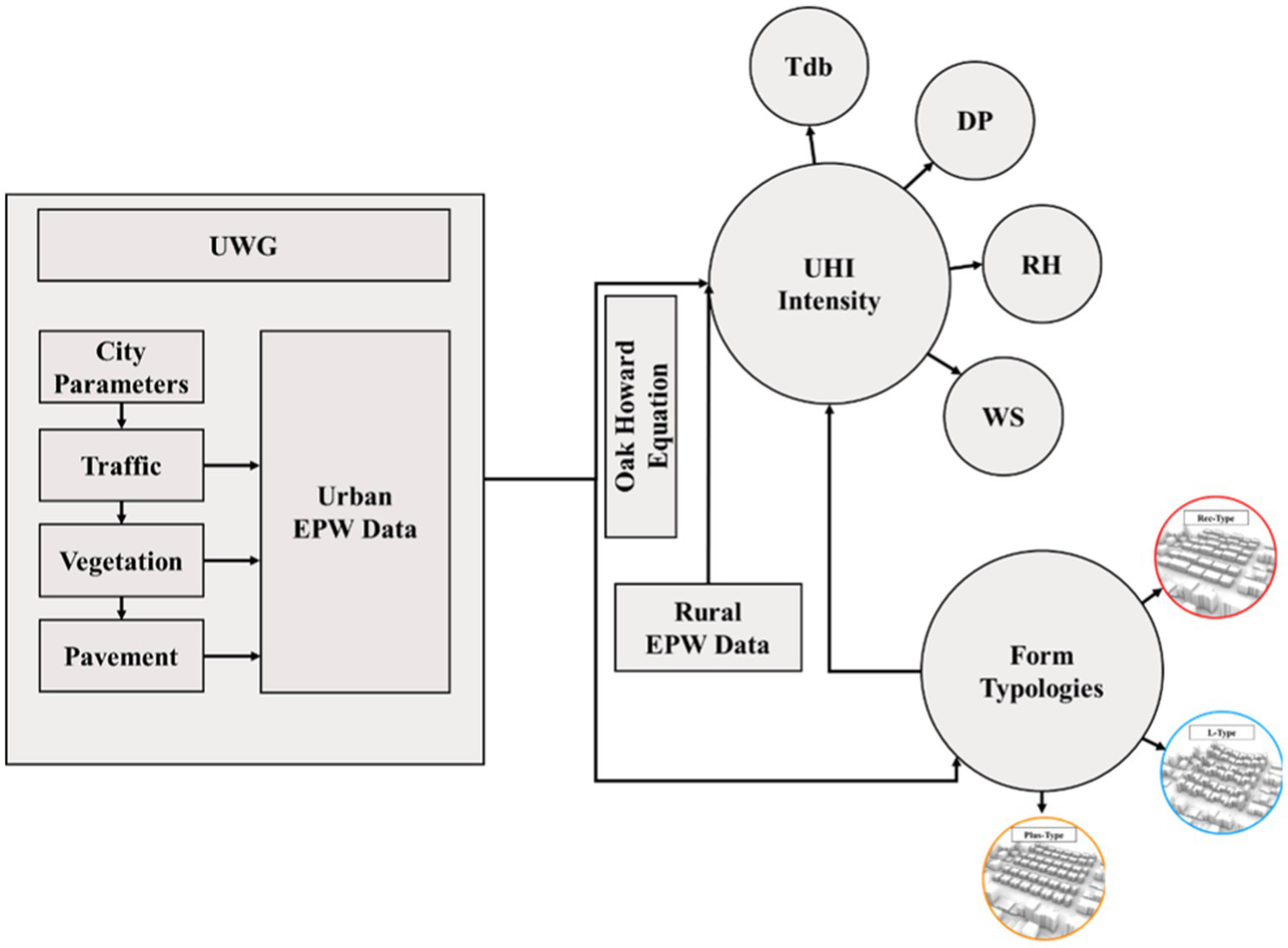 With regard to urban planning and morphology, classical theories, such as the concentric zone theory (Burgess, 2008), which mainly focused on the city structure and the functional area of the city can be noted (Lei et al., 2020). In general, urban forms can be described as spatial patterns of urban landscapes composed of different fundamental elements (Abrantes et al., 2017). Urban form usually refers to spatial structure and built environment patterns (Lowry and Lowry, 2014), and changes in the spatial characteristics of urban areas over time are generally known as urban growth patterns (Dahal et al., 2017). A number of designers have investigated the relationship between the city form and its four factors at the macro level: density, mix land-uses, centrality and accessibility of the streets (Changyeon, 2020), the transformation of the form and degeneration of old neighborhoods and the formation of modern neighborhoods, with the rule of automobiles, gentrifications, context rupture, passing from collectivism to individualism and, naturally, increasing energy consumption and fossil fuels (Lotfi et al., 2016). The effectiveness of using urban form to promote sustainable patterns and, consequently, the optimization of energy consumption, is considerable (Boarnet and Crane, 2001; Stevens, 2017). Urban forms (Kaza, 2020) with factors such as compactness, continuity (Brownstone and Golob, 2009), walking and travel speed (Liu and Shen, 2011), carbon footprint (Jones and Kammen, 2014) and demographic variables (Lopez, 2014) can affect energy consumption. Many studies have shown that urban form indicators have the most important impact on the heat islands of the city (Ward et al., 2016). However, the city form can be improved by building performance, thermal environments and urban form optimization strategies are a function for optimizing thermal environments (Yang et al., 2020). According to These Studies (21 to 34), the relationship between and effectiveness of form and UHI, in the form of a comprehensive and executive conceptual model based on the orientation and typification of the urban form, has not yet been investigated. In this research, the direct effect of UHI and its forms, types and the calculation of UHI intensity in different urban forms has been investigated and the aim is to reach a new result from previous research about to what extent the variability of parcels and their directions, and urban blocks affect the amount of UHI and climate changes? In this study, the Ferdous neighborhood of Tabriz (adjacent to Tabriz Grand Park (El GOLI) has been investigated in order to measure this relationship. In order to investigate these effects, three types of status quo form typologies (L-Type, Rec-Type, Cross-Type) with heat islands intensity indices (Dry bulb Temperature (Tdb), Dew point Temperature (DP), Relative Humidity (RH), Wind Speed (WS)) were measured and analyzed on the coldest and warmest days of the year, and the most optimal of these three types were presented for the cold and hot seasons in the form of two formic matrices.