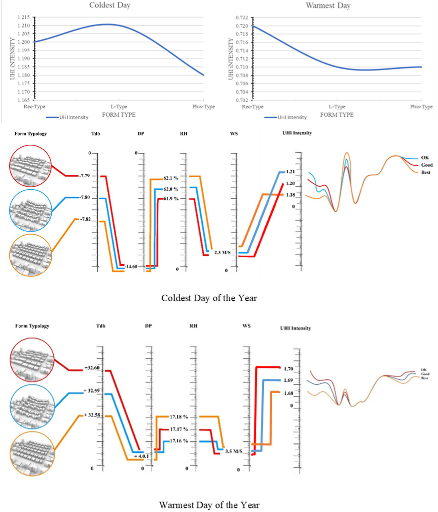 UHI intensity (in 3 form typologies) on the warmest and coldest days of the year.
