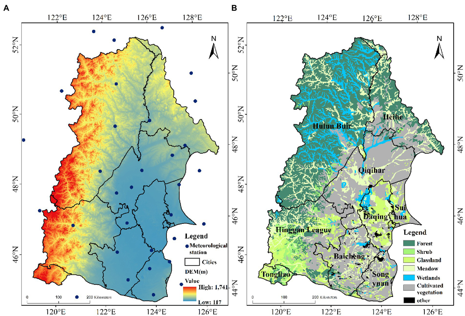 The NRB, with an area of 29.7 × 104 km2, is located in the central and western part of Northeast China (44–50°N, 120–128°E, Figure 1). It is hot and rainy in summer, whereas being cold and dry in winter (Du et al., 2013). The NRB is rich in cultivated land resources with sufficient sunshine, making it one of the major food production areas in China. Several important wetland nature reserves are located in this basin (such as Zhalong, Xianghai and Momoge wetlands; Wu et al., 2020b), with the vegetation in these wetlands possibly being more vulnerable to drought changes than other ecosystems (Qi et al., 2021). The Greater Khingan Mountains and the Lesser Khingan Mountains are located in the west and north of the NRB, making it the location of the “agriculture-wetland-forest” complex ecosystem. Recently, due to climate change and human activities, plant diversity has changed to varying degrees, which has affected the stability of the NRB ecosystem.