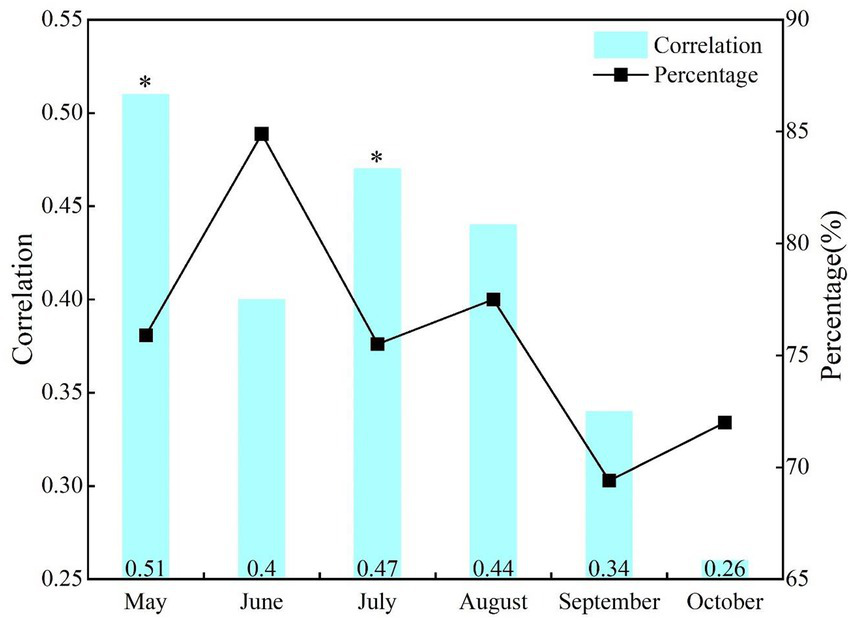 The correlation of the same period effect between NDVI and SPEI in the growing season of NRB varies greatly at different time scales (Figure 2). Although NDVI and SPEI were positively correlated, it began to decrease in July. The correlation between them was the most significant in May (r = 0.51, p < 0.05), while being the lowest in October (r = 0.26, p > 0.1). The proportion of areas with positive correlation was >69%, with the largest and smallest being in July (84.9%) and September (69.4%), respectively.