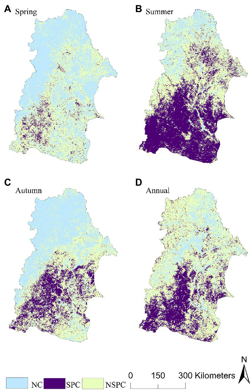 In this study, 1-, 3-, and 12-month scales of SPEI (SPEI-1, SPEI-3, and SPEI-12) were used to represent the drought conditions at different time scales in the NRB. SPEI-1 represents drought on a short time scale, thereby reflecting subtle changes in climate moisture during that month. SPEI-3 represents drought on a medium time scale, thereby reflecting the climate and moisture of the season. SPEI-12 means drought on a long-time scale, thus reflecting the cumulative climate water balance throughout the year. Therefore, SPEI can identify the effects of different drought types (short-term, medium-term, and long-term drought) on vegetation (Beguería et al., 2014; Zhang et al., 2017; Gebremeskel Haile et al., 2020).