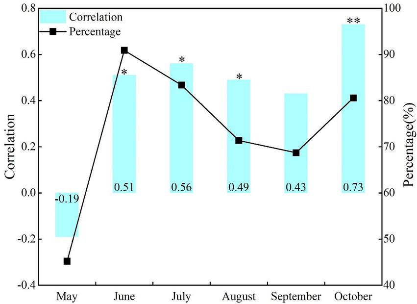 Correlations and area percentage of positive correlations between NDVI and SPEI at the same period effect of monthly scale. *p < 0.05, **p < 0.01; the same below.