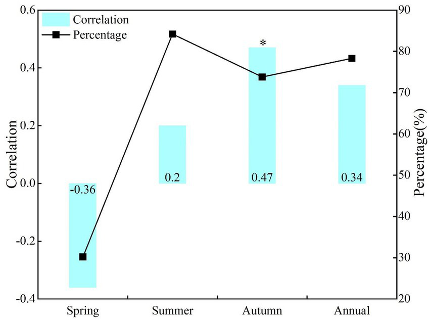 | Times | Area percentage of significant positive correlation (%) | Area percentage of negative correlation (%) |