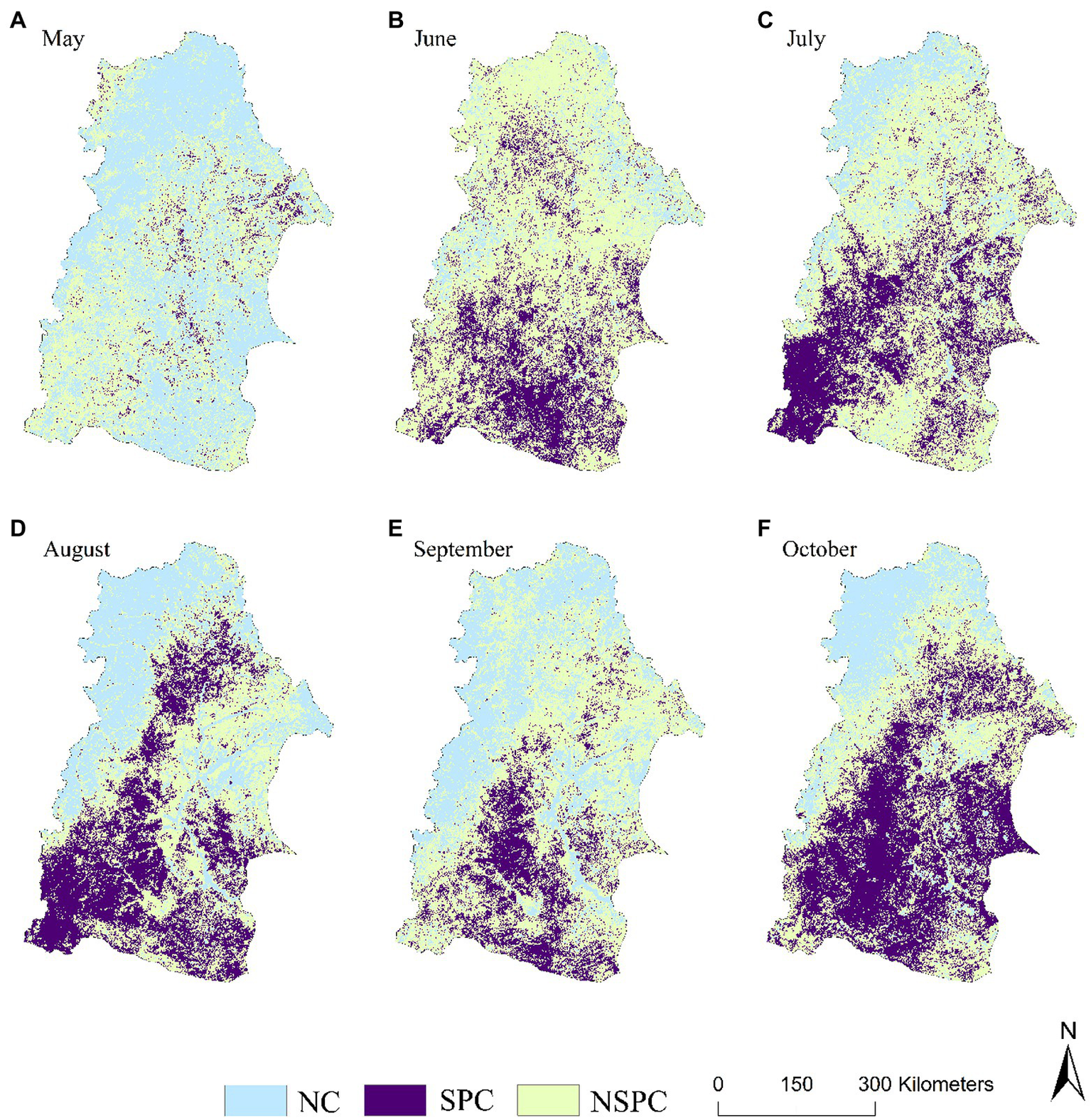 Spatial distribution of correlative level between the NDVI and SPEI same period effect at the monthly scale. NC: Negative correlation; SPC: Significant positive correlation; NSPC: Not significant positive correlation; the same below.
