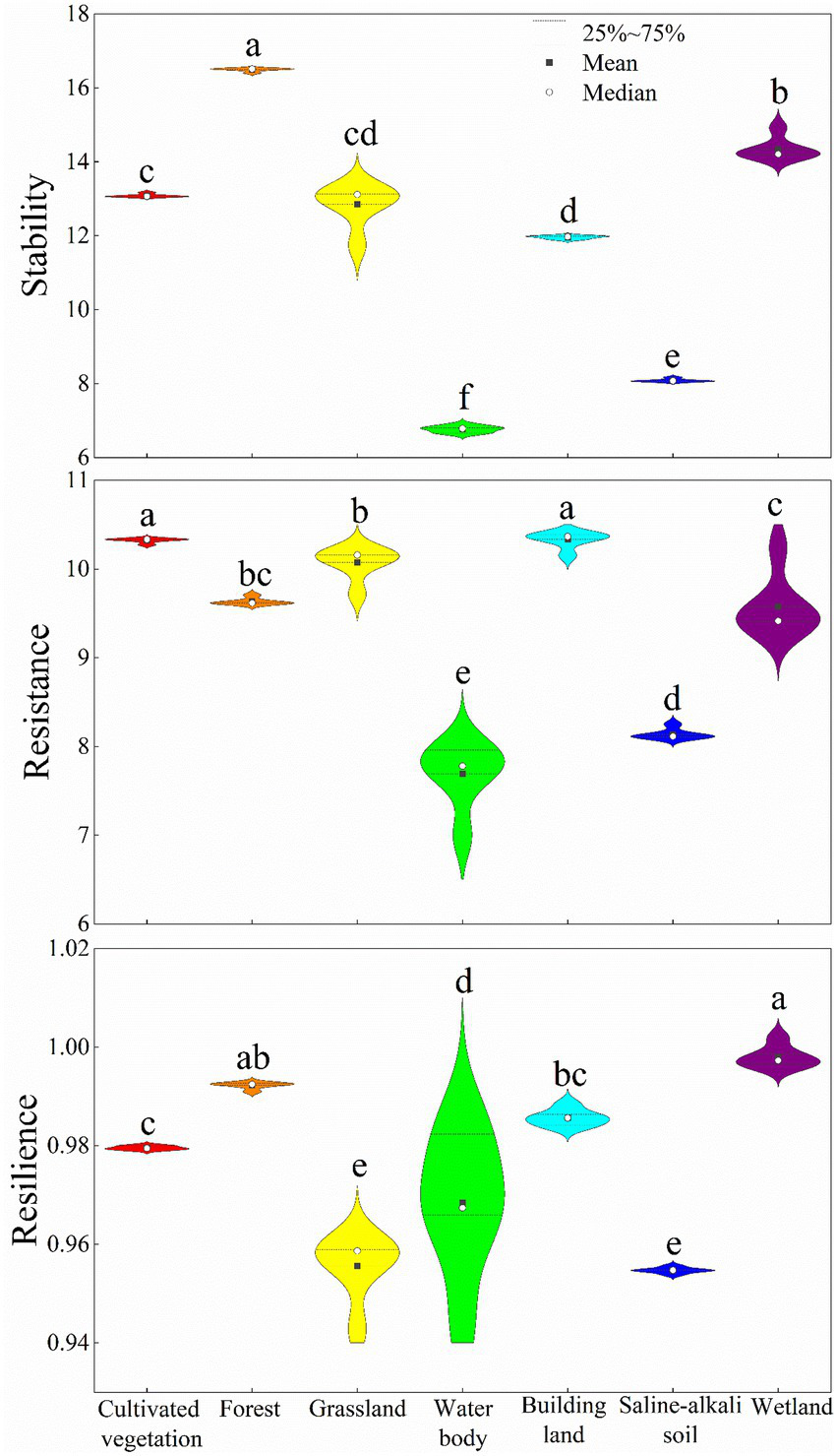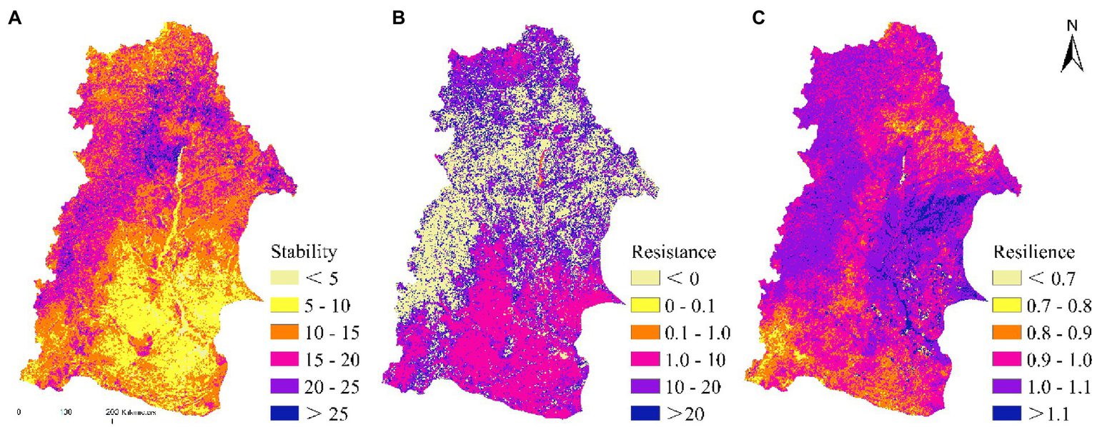 The coefficient of variation can represent the relative changes of geographical data and reflect its stability. We define the reciprocal of coefficient of variation as vegetation stability (Jiang et al., 2015). The ratio of the mean value of NDVI to its standard deviation during the entire study period, with larger value, the stronger the stability (Wu et al., 2021). The drought resistance of vegetation indicates the ability of vegetation structure and function to maintain their original state during drought (Ivits et al., 2016). Their drought resilience indicates the speed at which they return to normal post drought stress (Van Ruijven and Berendse, 2010). Each index has no unit and can be compared and evaluated under different vegetation types. The formulae are as follows: