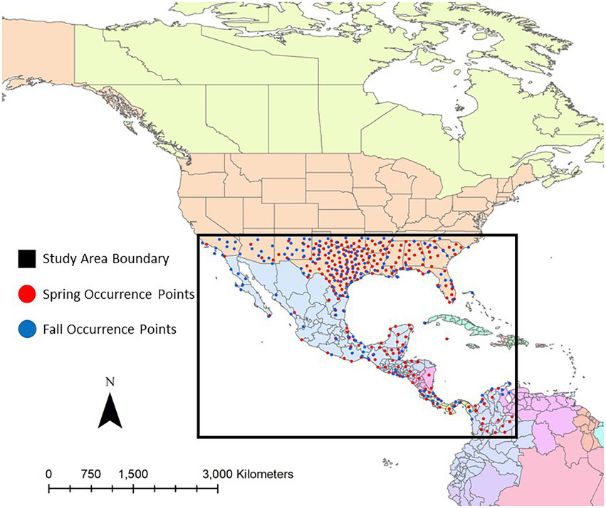 Map of the study area, representing the core of most Dickcissel migratory routes. Dickcissel occurrence points within this study area were used to estimate how habitat suitability for migrating Dickcissels relates to climate and landcover variables. Dickcissel occurrence points during spring migration are represented as red dots, and occurrence points during fall migration are represented as blue dots.