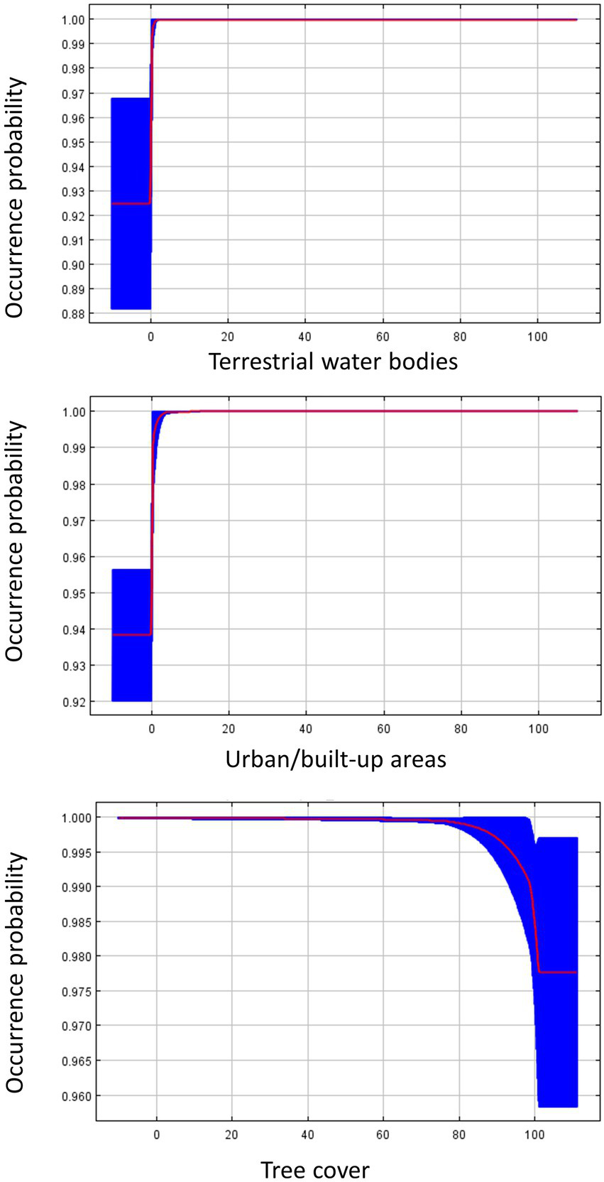 Response curves for influential land cover variables from the species distribution model predicting Dickcissel occurrence during fall migration. The response curves were generated in Maxent, and show how the predicted occurrence probability changes with each variable, while keeping all other variables at their average sample value. The red line plots the average value of the five model replicates, and the blue area plots the variance among the five replicates.
