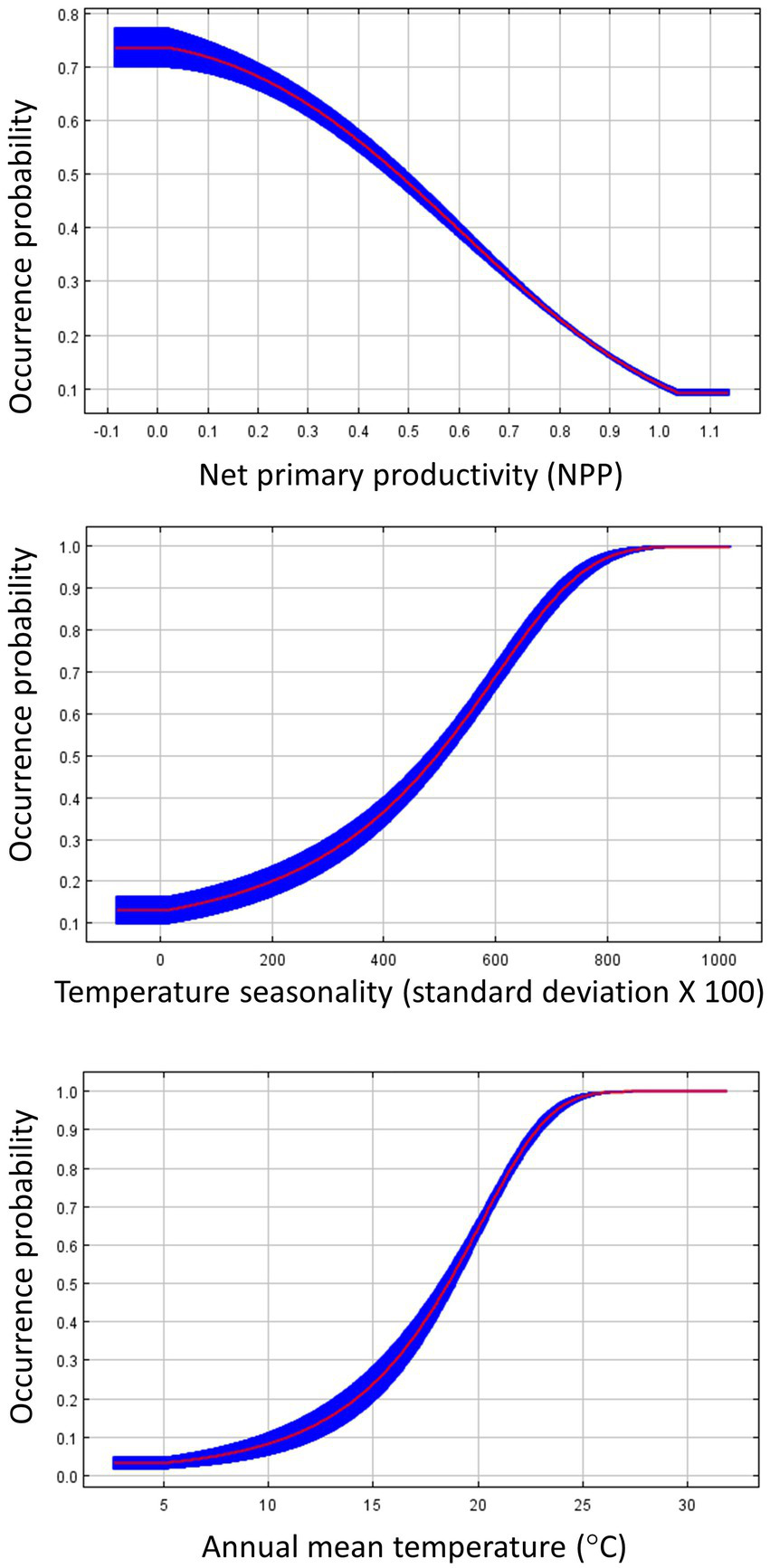 For our SDMs using fall migration occurrence points, the land cover model again demonstrated the best fit, with an OER of 0.115. The environment model was the second best with an OER of 0.118, while the environment + land cover model had an OER of 0.137 (Table 2). The most important contributors to the land cover model were water bodies (48.3% contribution to the model), urban/built-up areas (35.8%), and tree cover (14.9%). Variable response curves (Figure 4) suggest a preference for areas near water, as Dickcissel occurrence probability increased from 0.55 to >0.95 within 1 km of water. Dickcissel occurrence probability increased in the presence of urban areas and decreased in areas with high tree cover, though the differences in occurrence probability were smaller than that associated with water. The most influential variables for the environment model were NPP (33.6%), temperature seasonality (30.6%), and annual mean temperature (17.2%). Results from this model suggest that habitat suitability during fall migration is negatively related to NPP, and positively related to both annual mean temperature and temperature seasonality (Figure 5). Results from the environment + land cover model were similar to results from the land cover model, with water (45.3%), urban/built-up areas (33.2%), and tree cover (10.9%) being the most influential variables. Response curves were also similar to the land cover model, as Dickcissel occurrence probability increased in the presence of water and urban areas, and decreased in areas of high tree cover. Habitat suitability maps for fall migration SDMs are shown in Supplementary Figure S2.