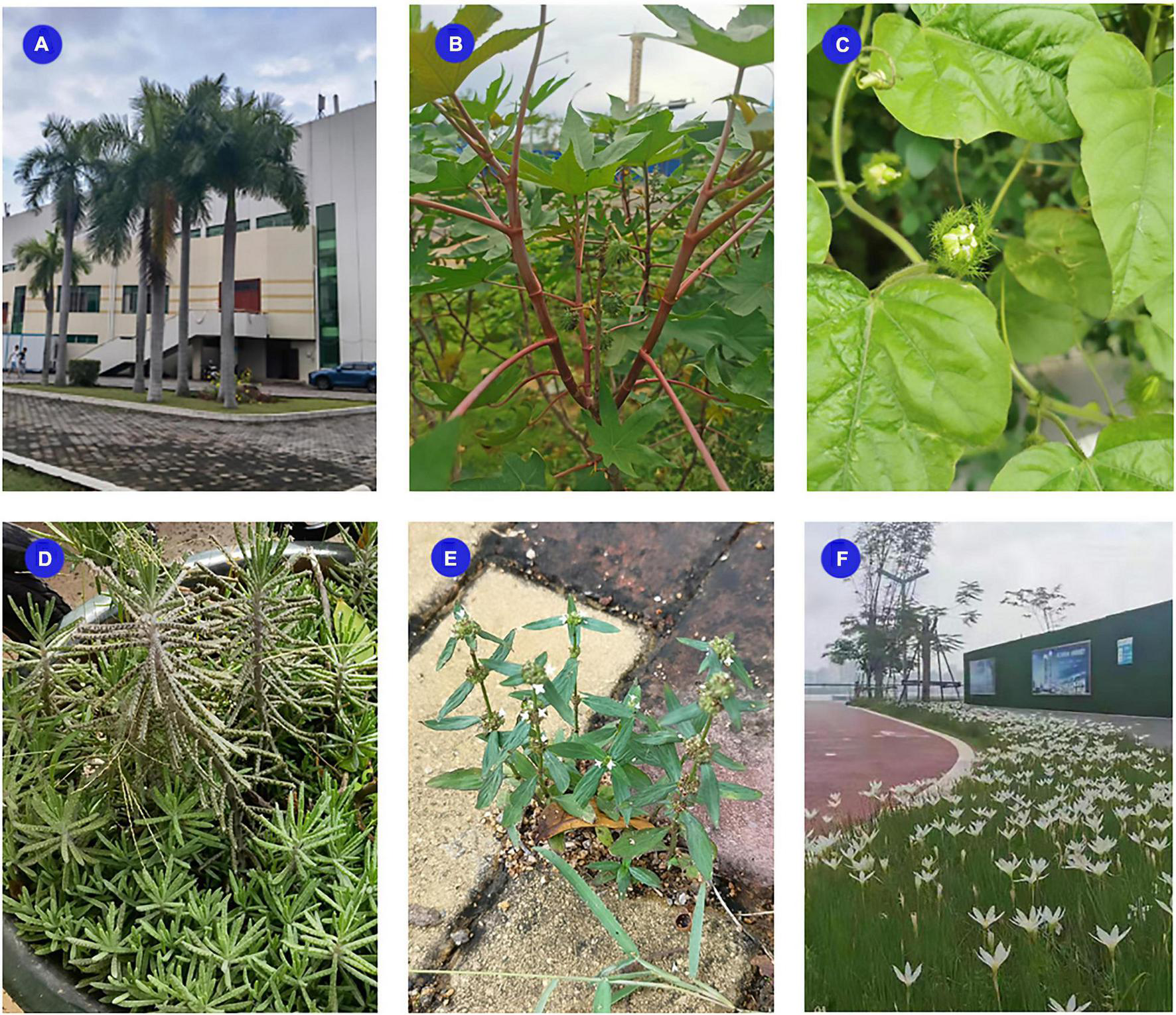 Some of the non-native plant species located within Hainan: (A)Wodyetia bifurcata (Arecaceae); (B)Ricinus communis (Euphorbiaceae); (C)Passiflora foetida (Passifloraceae); (D)Bryophyllum delagoense (Crassulaceae); (E)Spermacoce pusilla (Rubiaceae); (F)Zephyranthes candida (Amaryllidaceae).