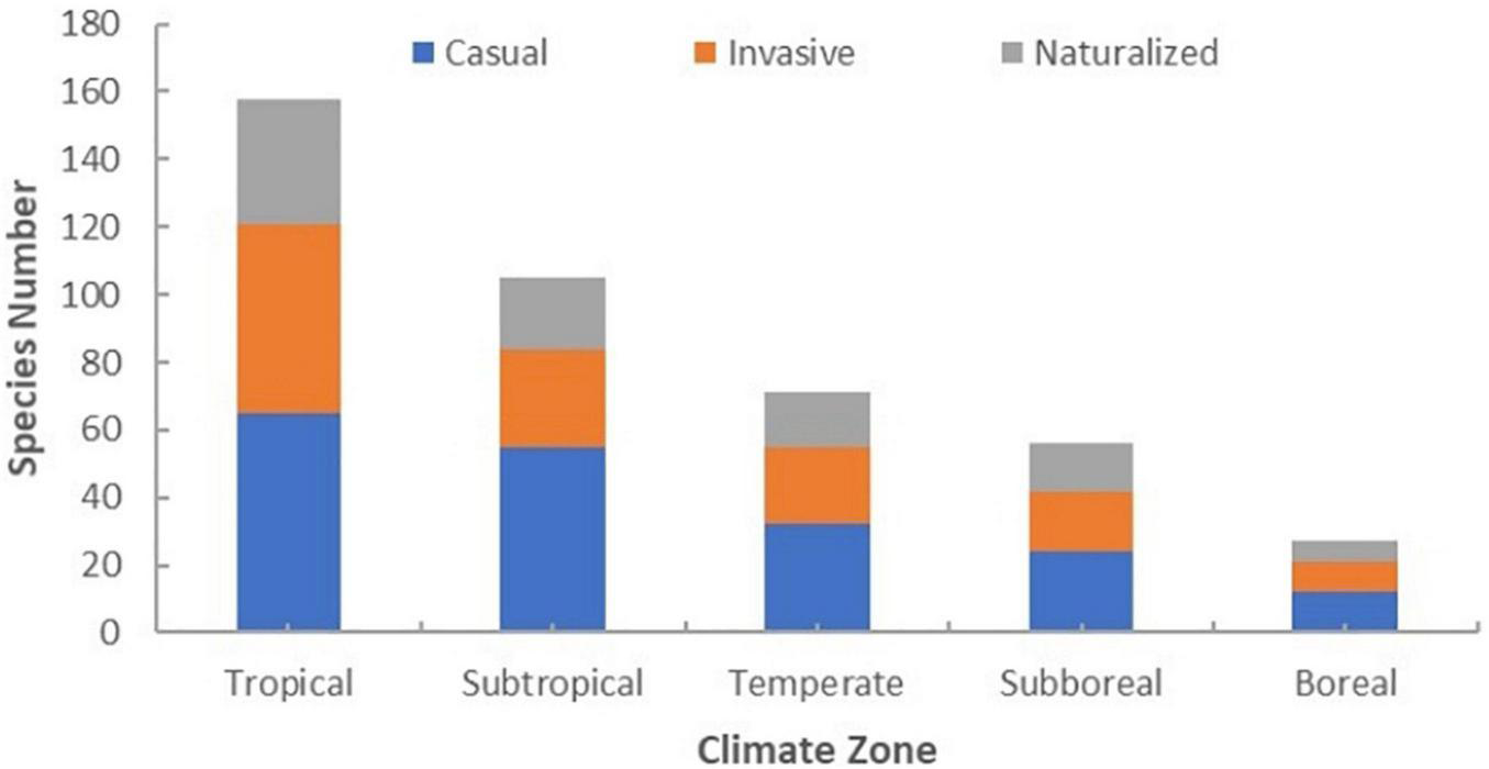 Statistical histogram of climatic origins of non-native, casual, invasive and naturalized plant species in Hainan.