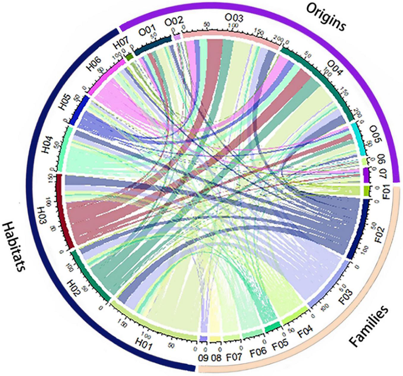 Chord diagram denoting the relationships among the habitat, place of origin, and top nine families of non-native plants. Habitats: (H01) rural and urban built-up areas, (H02) agricultural areas, (H03) grasslands and shrublands, (H04) forest and forest margins, (H05) inland rocky outcrops, (H06) inland wetlands and water bodies, (H07) coastal areas (including mangroves, beaches, etc.); origins: (O01) Asia, (O02) Europe, (O03) North America, (O04) South America, (O05) Africa, (O06) Oceania, (O07) Unknown; top nine families: (F01) Polygonaceae, (F02) Fabaceae, (F03) Asteraceae, (F04) Poaceae, (F05) Euphorbiaceae, (F06) Amaranthaceae, (F07) Malvaceae, (F08) Verbenaceae, and (F09) Cactaceae. The arc length of each chord terminus represents the cumulative number of the habitat, place of origin, and family of non-native plants. The thickness of the chord curves represents the number of non-native plants for the habitat, place of origin, and family.