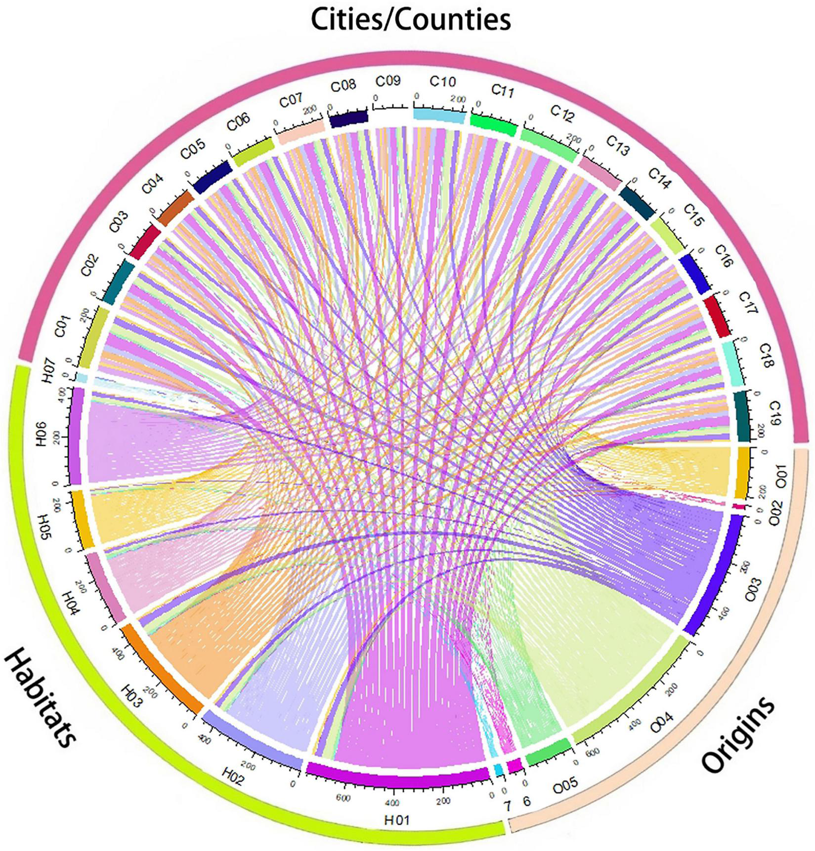 Chord diagram denoting the relationships among the habitat, place of origin, and distribution administrative unit (city/county) of non-native plants. Habitats: (H01) rural and urban built-up areas, (H02) agricultural areas, (H03) grasslands and shrublands, (H04) forest and forest margins, (H05) inland rocky outcrops, (H06) inland wetlands and water bodies, (H07) coastal areas (including mangroves, beaches, etc.); origins: (O01) Asia, (O02) Europe, (O03) North America, (O04) South America, (O05) Africa, (O06) Oceania, (O07) Unknown; distribution city/county: (C01) Haikou, (C02) Sanya, (C03) Sansha, (C04) Wuzhishan, (C05) Wenchang, (C06) Qionghai, (C07) Wanning, (C08) Ding’an, (C09) Tunchang, (C10) Chengmai, (C11) Lin’gao, (C12) Danzhou, (C13) Dongfang, (C14) Ledong, (C15) Qiongzhong, (C16) Baoting, (C17) Lingshui, (C18) Baisha, and (C19) Changjiang. The arc length of each chord terminus represents the cumulative number of the habitat, place of origin, and distribution city/county of non-native plants. The thickness of the chord curves represents the number of non-native plants for the habitat, place of origin, and distribution city/county.