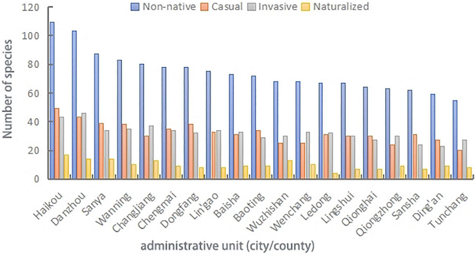 We determined the number of non-native species in each administrative unit as well as their status as naturalized, casual, or invasive (Figure 7). Haikou had the highest number of non-native (109), casual (49), invasive (43), and naturalized (17) species, while Tunchang had the lowest for each (55, 20, 27, and eight, respectively) (Figure 7, 8 and Supplementary Appendix 1.