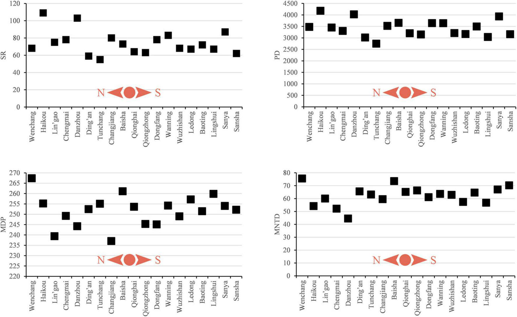 Line charts of the four measures of diversity of non-native plant species in each administrative unit (city/county) in Hainan. The four measures of taxonomic diversity are Species richness (SR), Faith’s phylogenetic diversity (PD), phylogenetic Mean Pairwise Distance (MPD), and phylogenetic Mean Nearest Taxon Distance (MNTD).