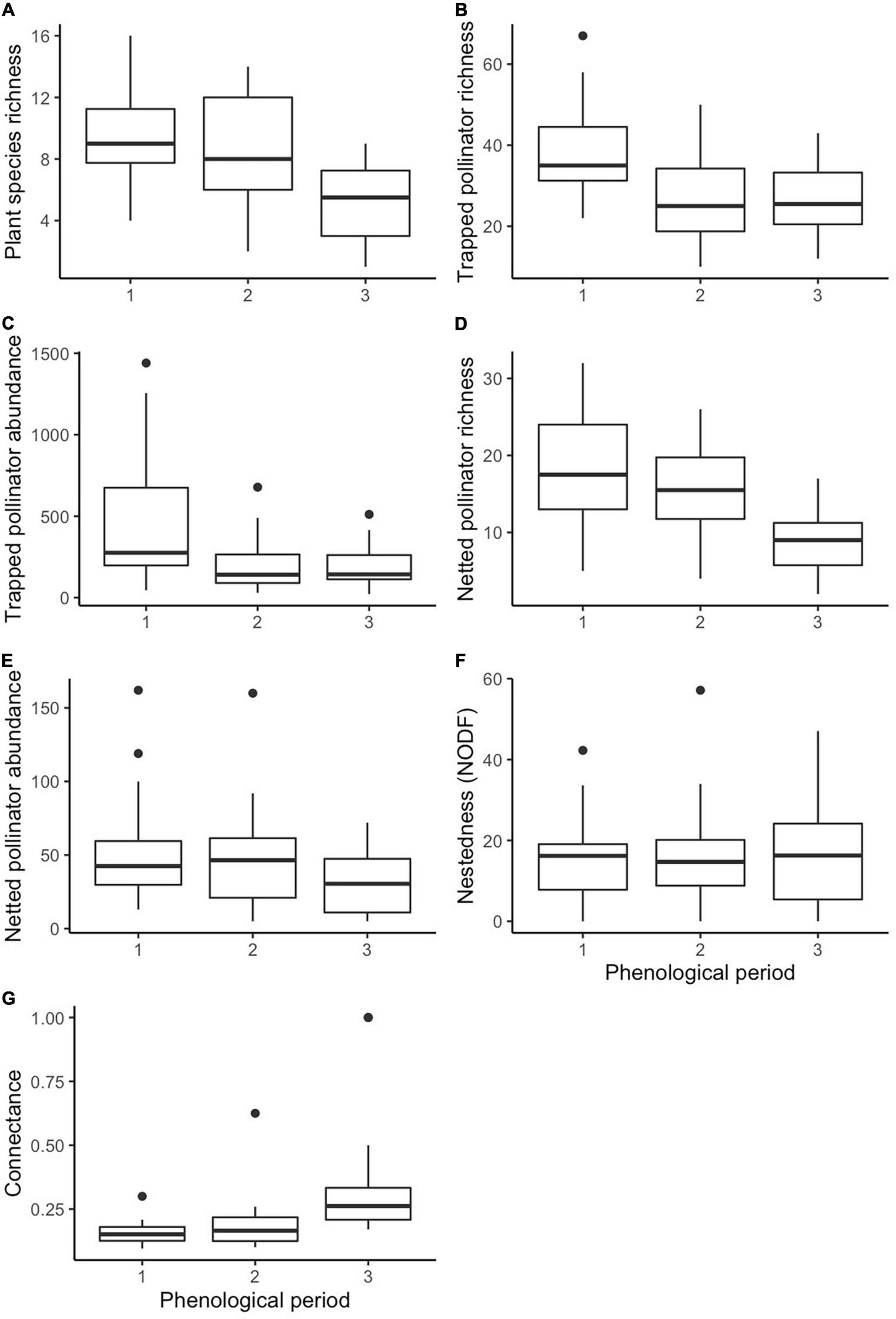 Boxplots displaying phenological period as a significant predictor of plant species richness (A), trapped pollinator richness (B), trapped pollinator abundance (C), netted pollinator richness (D), netted pollinator abundance (E), network NODF (F), and network connectance (G).