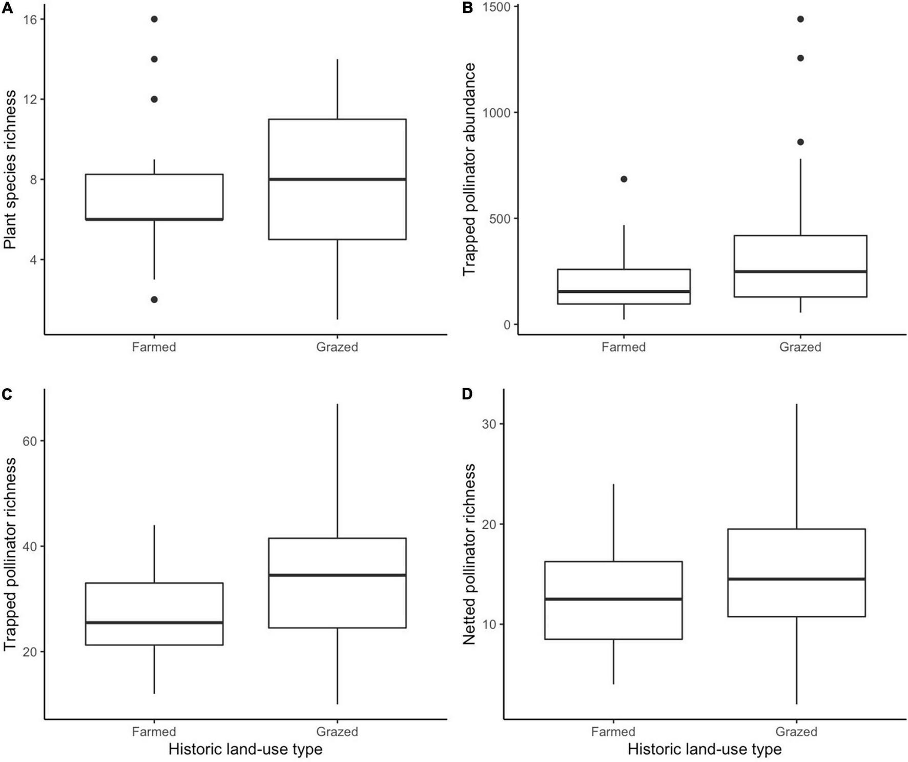 Boxplots displaying historic land-use as a significant predictor of plant species richness (A), trapped pollinator abundance (B), trapped pollinator richness (C), and netted pollinator richness (D).