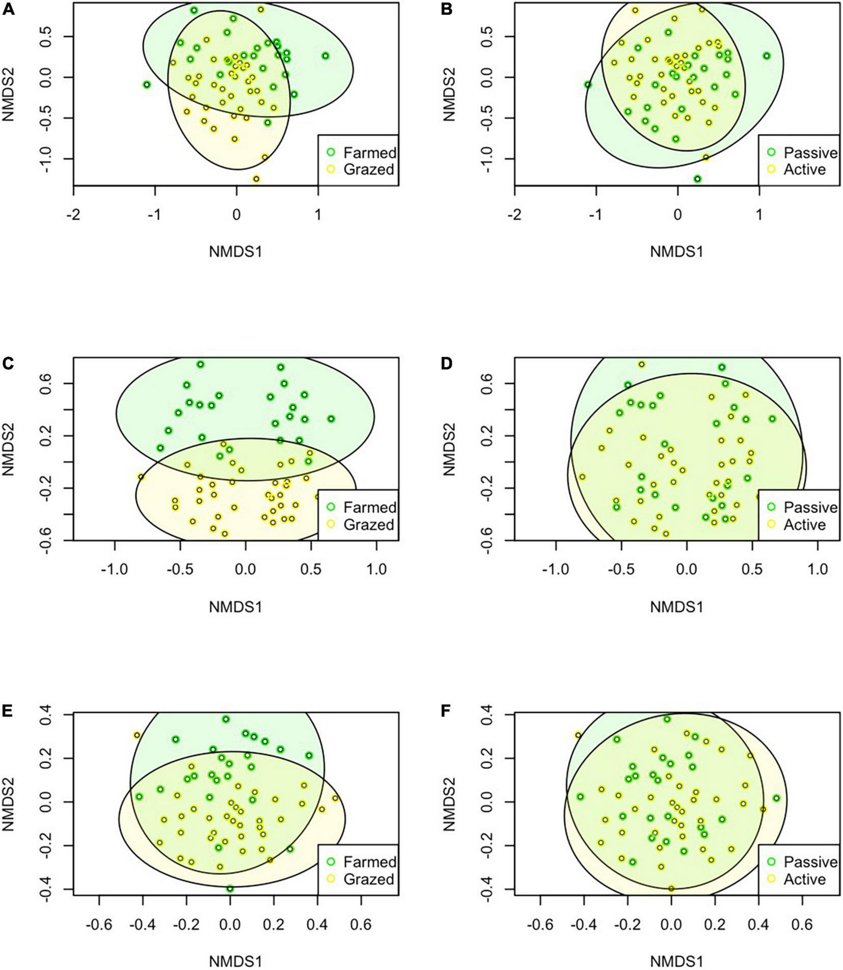 NMDS plots showing the differences between communities for plants between the historic land-use types (A) and current management types (B), for trapped pollinator communities between historic (C) and current (D), and for netted pollinators for historic (E) and current practices (F).