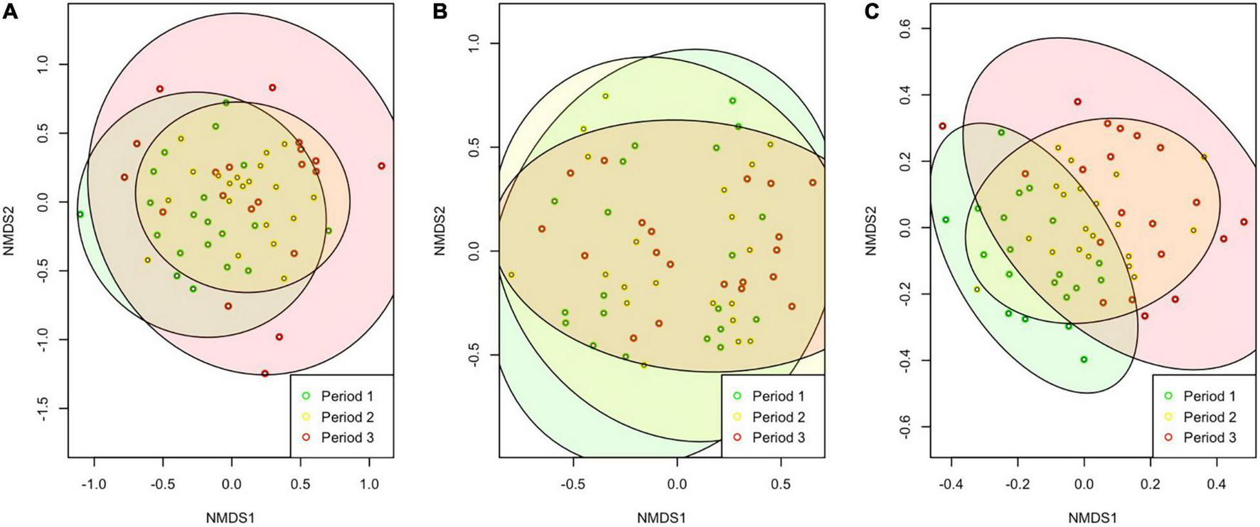 NMDS plots showing the community dissimilarity driven by phenological periods 1, 2, and 3 for the plant (A), trapped pollinators (B), and netted pollinator (C) communities.