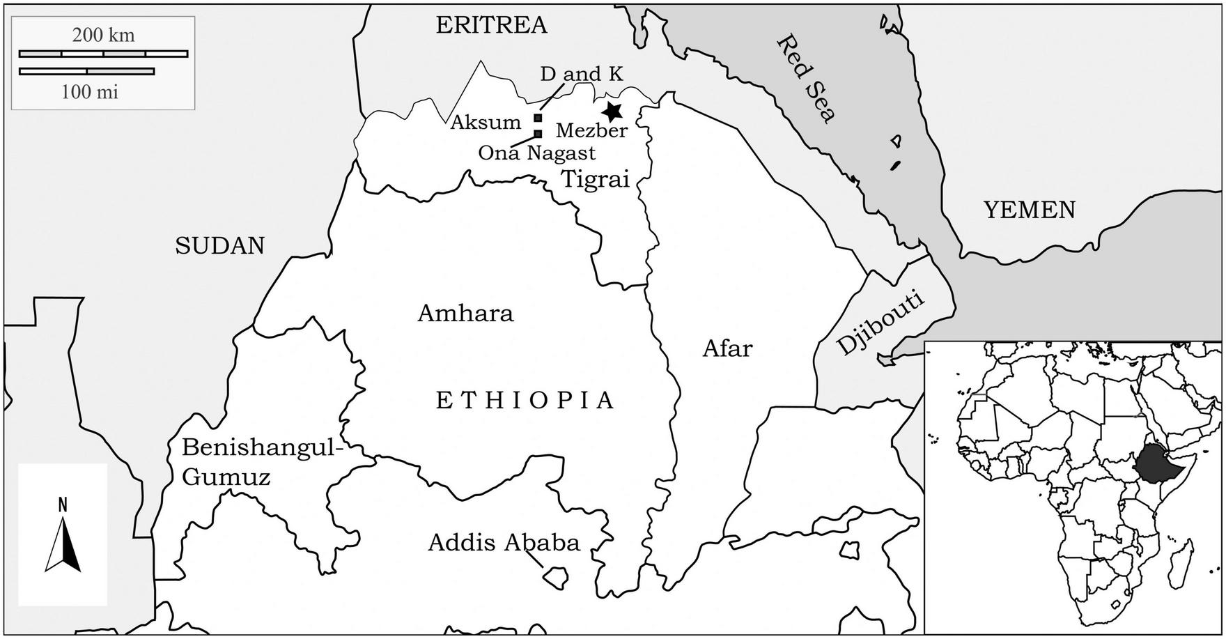 The location of the Pre-Aksumite site Mezber and Aksumite sties mentioned in the text (sites D, K, and Ona Nagast).