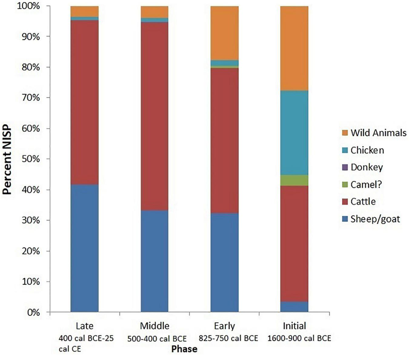 Zooarchaeological specimens were recovered from seven different contexts with established proveniences and AMS dates: Field A.1 (one complete room and a cobbled surface); A.2 (walls and domestic space); A.3 (rooms and a unique hearth-like feature); B (compare [cf.] outdoor crop processing area); C (room fill); D (room fill); and E (room fill and trash disposal area) (Figure 2). Each field included deep soundings excavated to bedrock. In order to make a meaningful analysis, the samples were grouped into the four main cultural phases, and interpretations of animal remains were based on stratigraphic information available from deep sounding in Field C (stratigraphic trench), that provided a continuous representation of the cultural sequences found at the site (D’Andrea et al., in review see text footnote 1). In addition to the AMS dates and stratigraphic information from deep sounding C and other fields, chronology for the faunal analysis was also based on direct AMS dates from, chicken, cattle, domestic dog, and donkey bones (Table 1). Sample size data for each excavation area, for all the field seasons, are summarised in Table 3 and Figure 3.