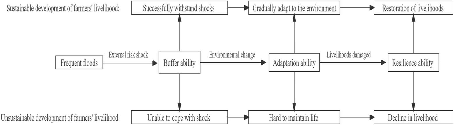 As the most basic economic agents in rural ecosystems, the livelihoods of farmers are most directly affected by floods (Tran et al., 2018; Zhou et al., 2021). Since the 1980s, “livelihood,” a new perspective for the study of rural economy and the sustainable utilization of natural resources, has become a hot topic of academic attention (Quandt, 2018; Wang et al., 2021; Yang et al., 2021). Many researchers have developed a multi category livelihood development analysis framework based on Srinivasan and Amartya (1983) feasible ability theory, Among them, the most widely used is the sustainable living hood approach (SLA) proposed by the United Kingdom Department for International Development (DFID) (Saxena et al., 2016; Quandt et al., 2017; Tsolakis et al., 2021). This theoretical framework allows researchers to describe how farmers use their capital holdings and external public services to develop livelihoods in risky environments and changing institutions and organizations. However, traditional livelihood theory has focused mainly on the stock of livelihood capital of farmers and how it is combined, neglecting the ability of farmers to adapt and recover under the impact of external shocks (Shikuku et al., 2017; Reyes-Garcia et al., 2019). As threats from climate extremes intensify, more and more researchers are focusing on the role of resilience thinking in the study of livelihoods (Abdul-Razak and Kruse, 2017).