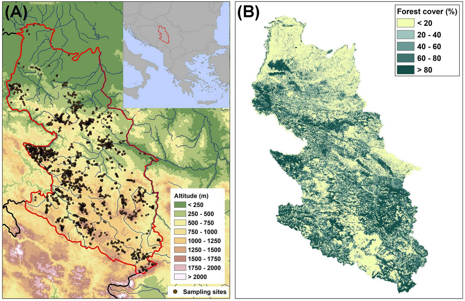 (A) Map of the study area (central Balkans: western Serbia) with sampling sites where orchids were found (the boundaries of the study area are marked by the red line); (B) the density of forest cover in the study area.