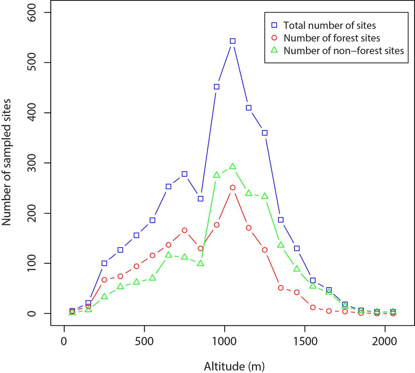 The number of sampling sites for each altitudinal interval where orchids were found.