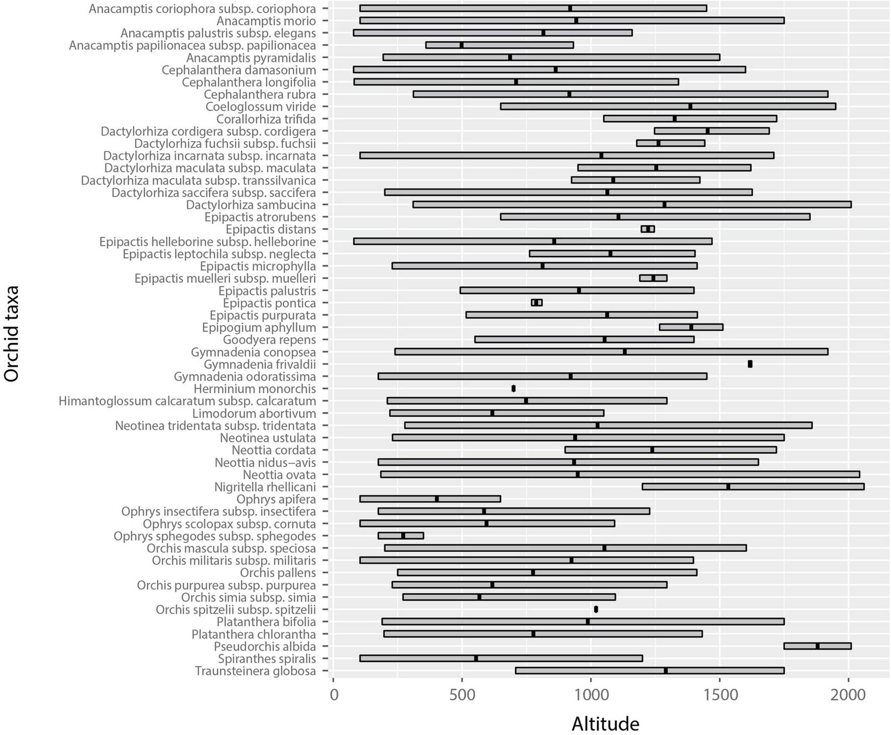 The main objectives of this study were: (i) to determine altitudinal range size of individual orchids and compare altitudinal range size and mean altitude of occurrence of orchid species and subspecies with different life traits (underground organ systems, pollination systems); (ii) to analyze orchid species richness and density along the altitudinal gradient; (iii) to determine how the richness and density of orchid species with different life traits (underground organ systems, pollination systems) vary with altitude. Patterns of species richness and density along the altitudinal gradient were explored for the total orchid flora, as well as for the orchid flora recorded in forest and non-forest habitats.