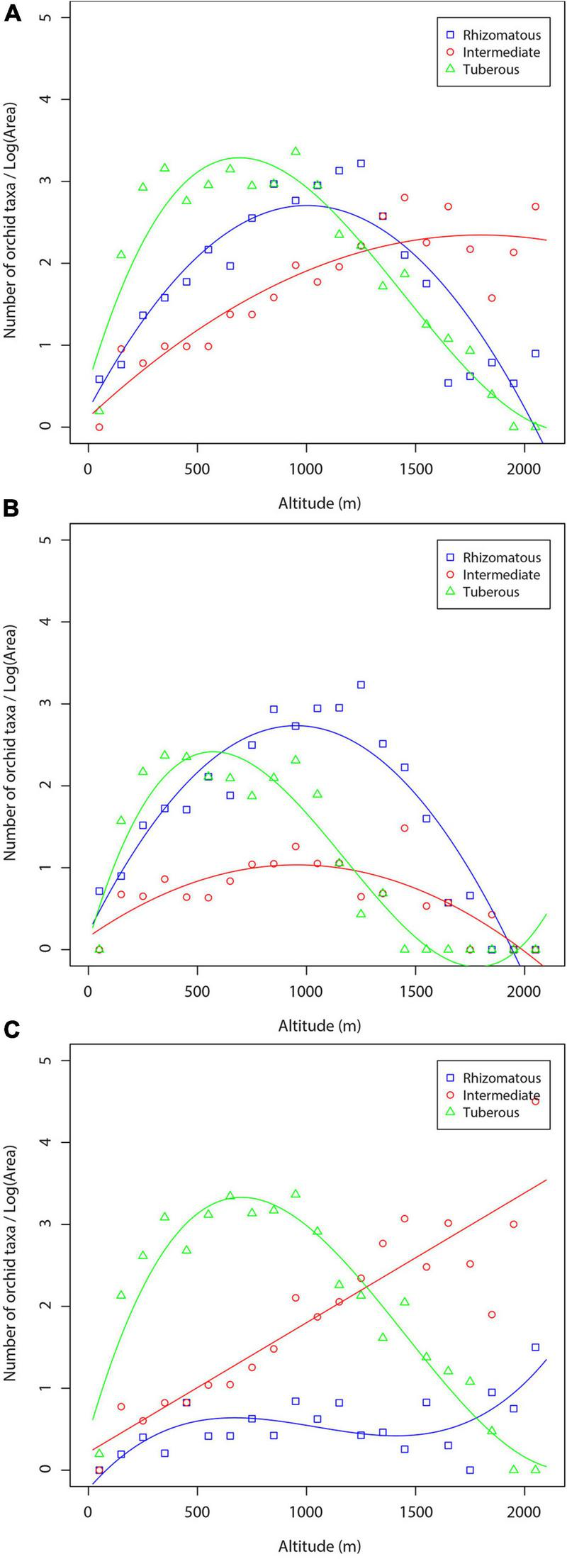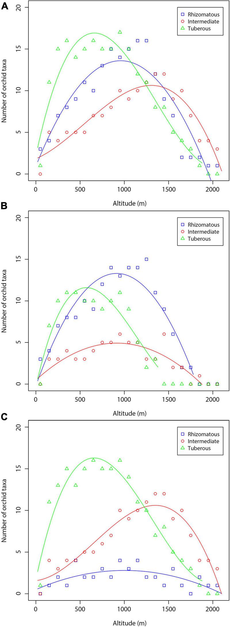 Orchid richness in terms of the number of rhizomatous, intermediate, and tuberous orchid taxa for the three data sets (total orchids, orchids of forest habitats, orchids of non-forest habitats) are shown in Figure 5. The regression lines of orchids of each orchid life form have rather the same shape (a hump-shaped pattern). Tuberous species dominate at low and mid-altitude zone, the rhizomatous orchids present their highest richness at c. 1,100–1,300 m, whereas intermediate orchids dominate at high-altitude areas (Figure 5A). The results concerning orchids of the forest habitats were of the similar shape for all three orchid groups (Figure 5B). However, tuberous orchids dominate at low altitude areas, whereas the rhizomatous orchids dominate from mid-altitude area to high-altitude zone (Figure 5B). In the case of orchids of non-forest habitats, tuberous orchids dominate in low and mid-altitudinal zone (0–1,200 m), whereas the intermediate orchids dominate between 1,200 and 2,100 m (Figure 5C).