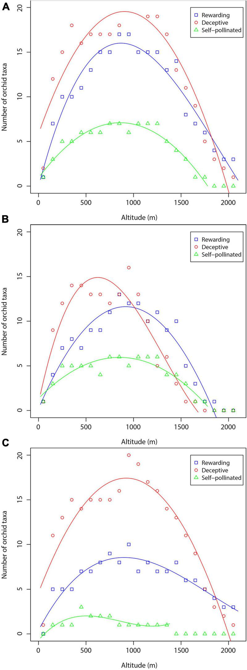 Richness of orchid species and subspecies of specific pollination systems along the altitudinal gradient: (A) total number of orchid taxa; (B) orchids of forest habitats; (C) orchids of non-forest habitats.