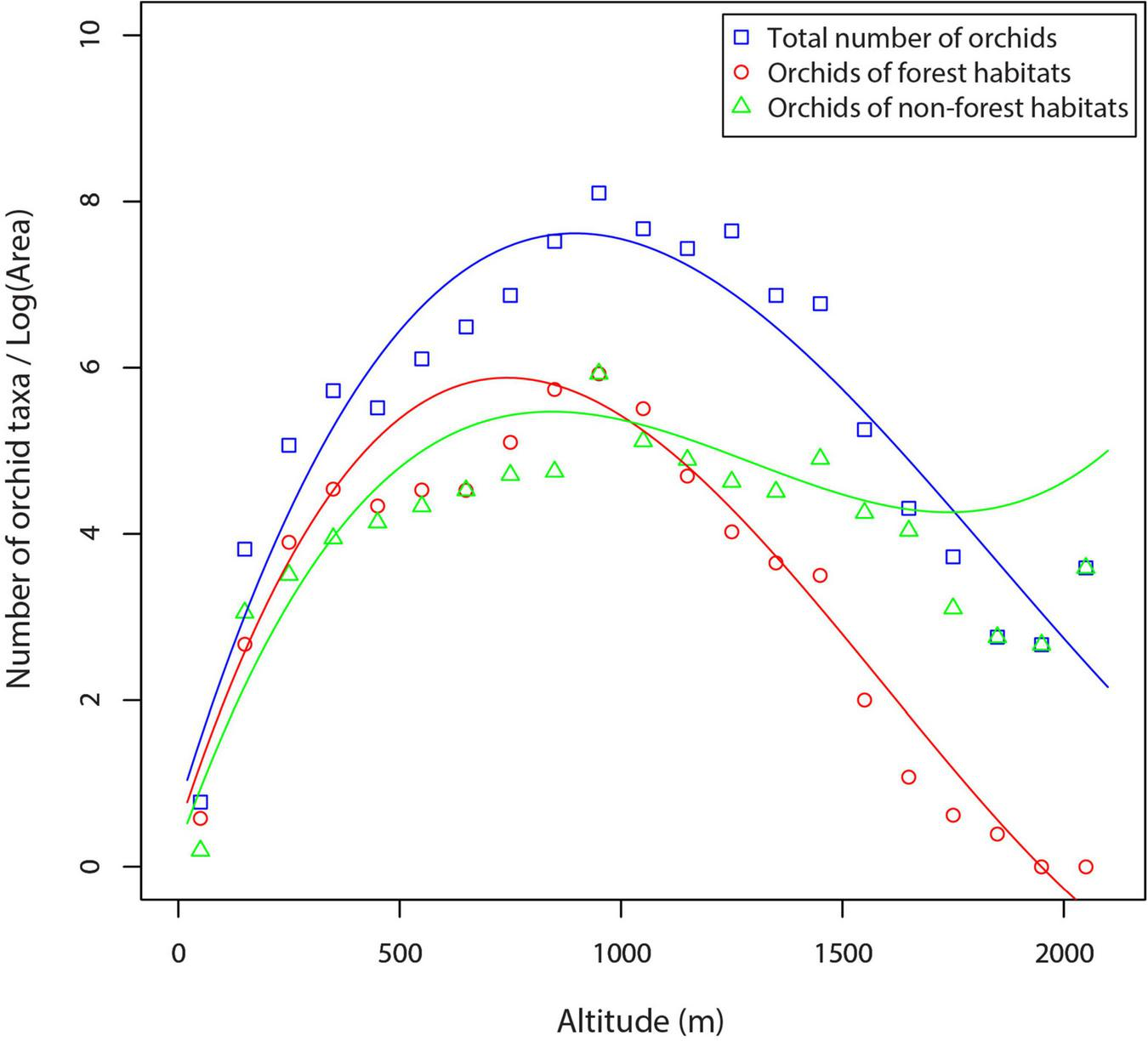 Regression analysis showed a significant effect of altitude on orchid species richness in both forest and non-forest habitats (Table 1 and Figure 4). Both orchids of forest habitats and orchids of non-forest habitats showed a hump-shaped relationship with the altitudinal gradient, peaking between 901 and 1,000 m (Figure 4). In the altitudinal zone from 0 to 1,100 m, the richness of orchids of forest habitats is generally higher than the richness of orchids of non-forest habitats (Figure 4). However, with increasing altitude (from 1,101 to 2,100 m), the richness of orchids of non-forest habitats is higher than the richness of orchids of forest habitats (Figure 4).