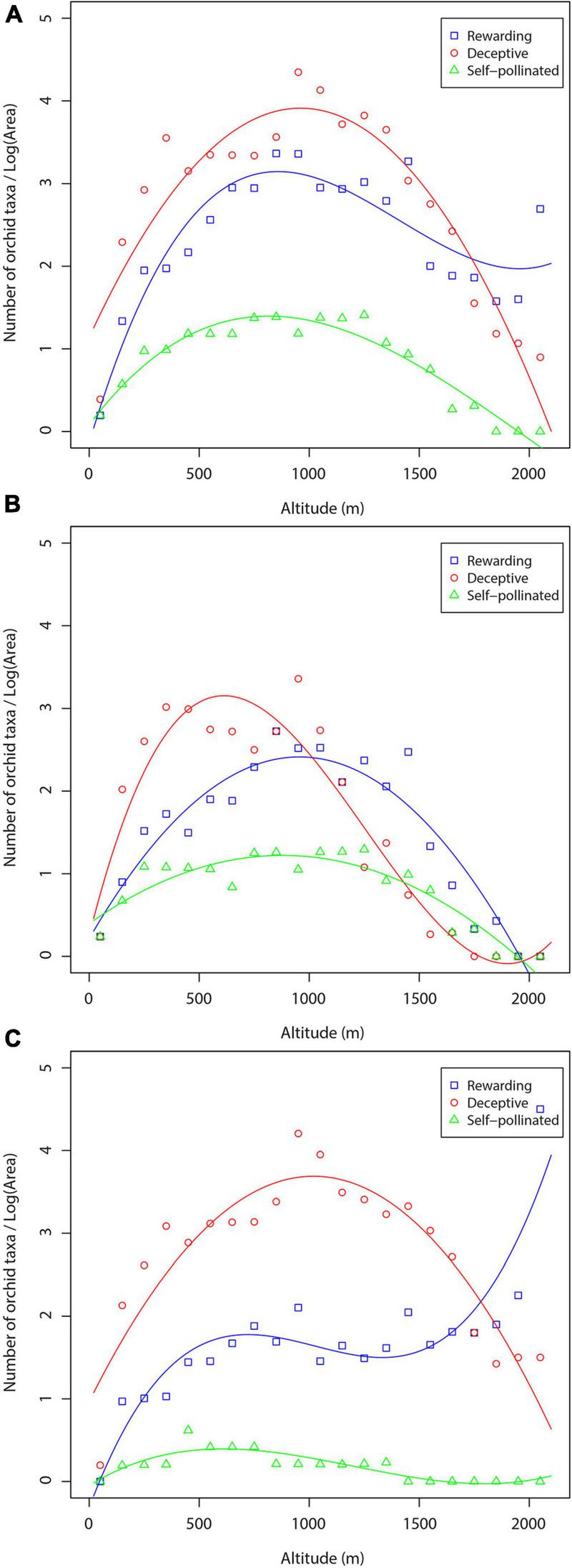 The trends in orchid species richness along the altitudinal gradient based on the three pollination mechanisms are shown in Figure 6. The orchids of each orchid pollination system showed a hump-shaped relationship with the altitudinal gradient, peaking at mid-altitude zone (Figure 6A). In general, the richness of deceptive orchids is greater than the richness of rewarding and self-pollinated orchids at altitudes between 0 and 1,700 m, whereas the richness of rewarding orchids is higher than the richness of deceptive and self-pollinated orchids at altitudes between 1,700 and 2,100 m (Figure 6A). The altitudinal patterns of orchid species richness of specific pollination systems were hump-shaped also in cases when orchids of forest and non-forest habitats were considered separately (Figures 6B,C). All the correlations between orchid species richness and altitude using the three datasets were statistically significant (P < 0.001 or P < 0.01) (Tables 2, 3), whereas the predictive power was very high in almost all regressions.