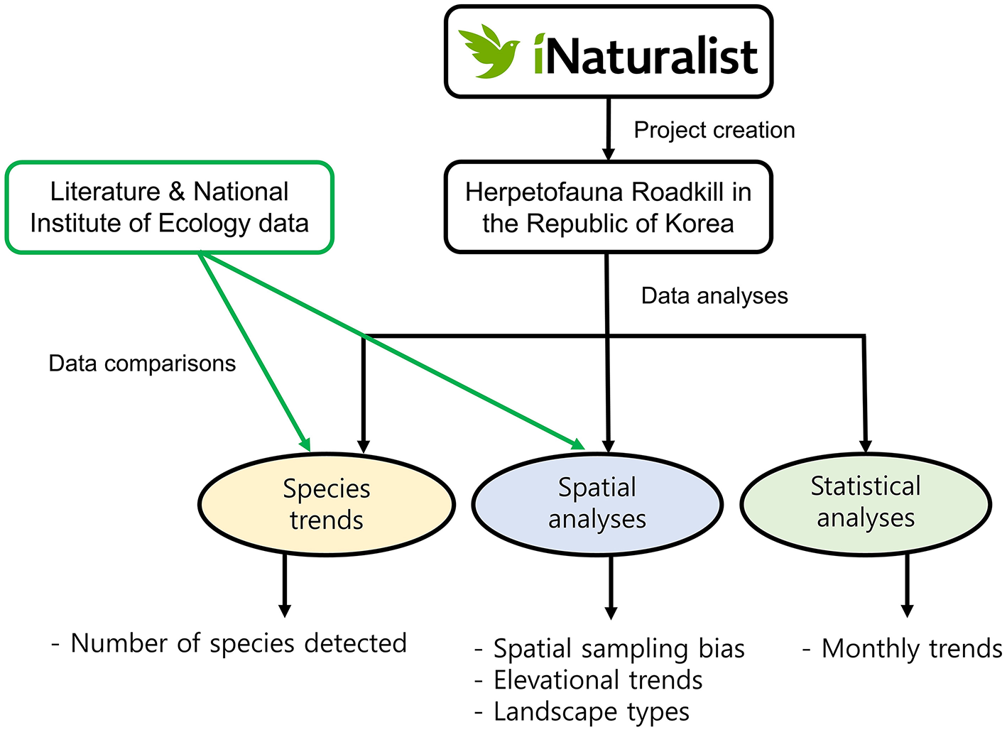 Flow chart of data analyses on the roadkill dataset collected through iNaturalist. The project can be retrieved at: https://www.inaturalist.org/projects/herpetofauna-roadkill-in-the-republic-of-korea.