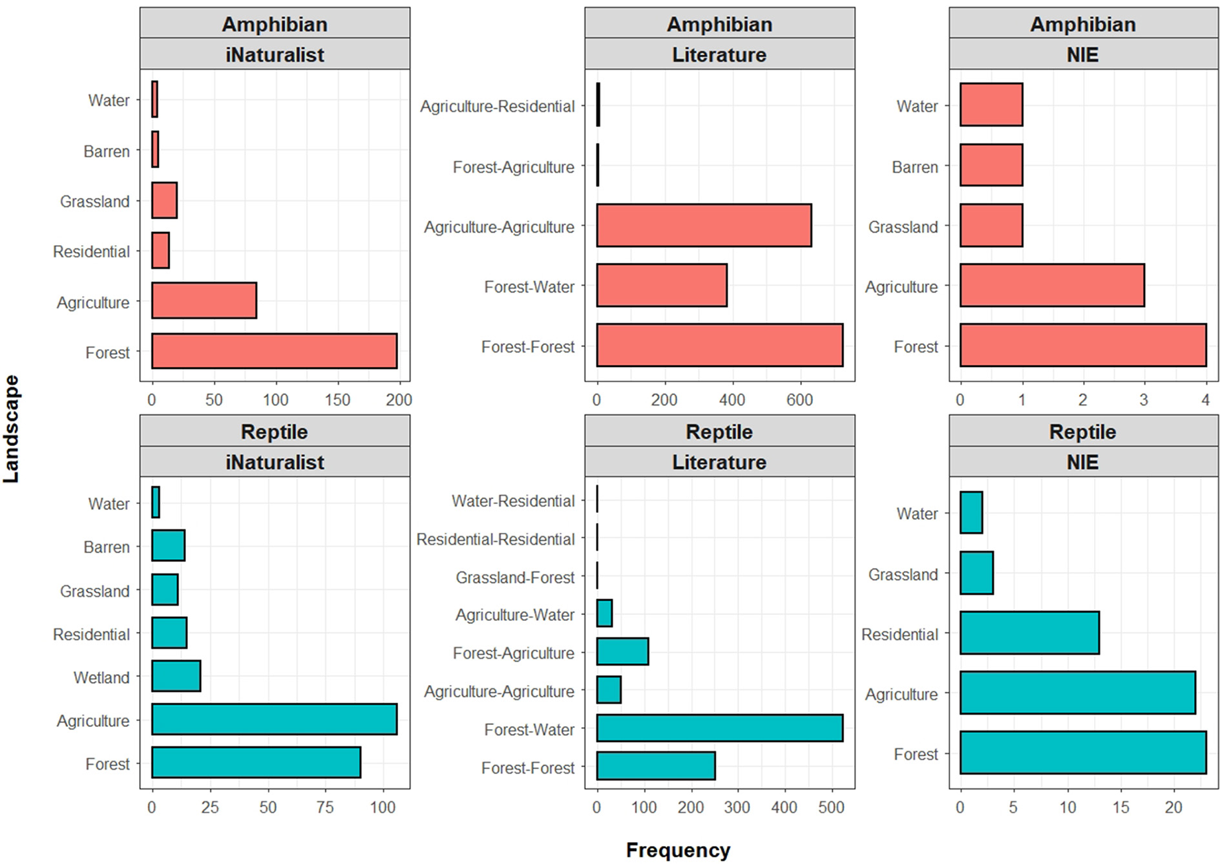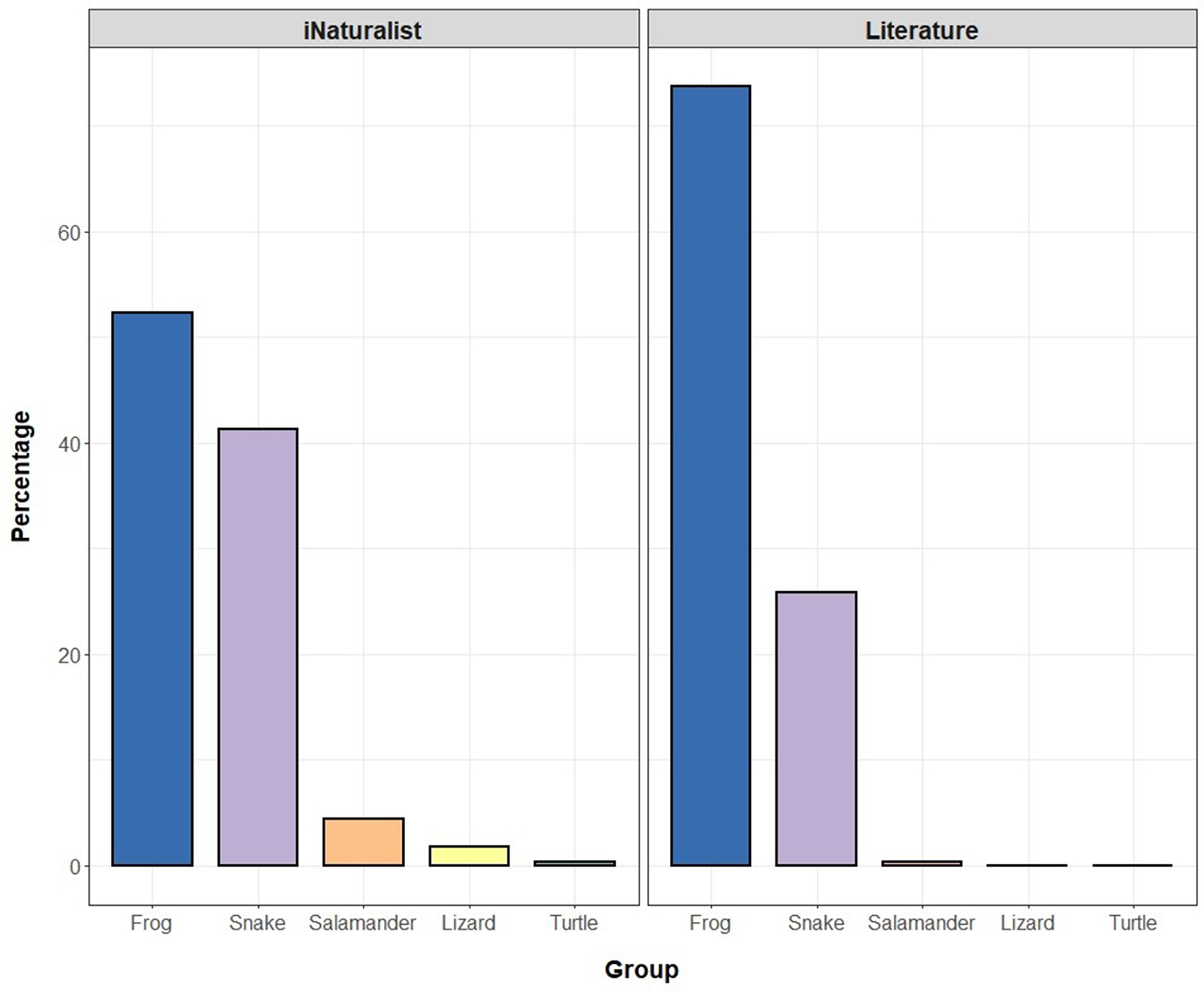 Considering the taxonomic representation in both citizen science and literature data, anuran amphibians were detected at the highest frequency (iNaturalist: n = 333; literature: n = 7,828), followed by snakes (iNaturalist: n = 260; literature: n = 2,750), salamanders (iNaturalist: n = 28; literature: n = 33), lizards (iNaturalist: n = 11; literature: n = 5), and turtles (iNaturalist: n = 2; literature: n = 2; Figure 3). We converted the raw frequency to percentage to apply the same unit of comparison between the two datasets (iNaturalist and literature). Overall, the two datasets were comparable in terms of the percentage of species detected (Figure 4).