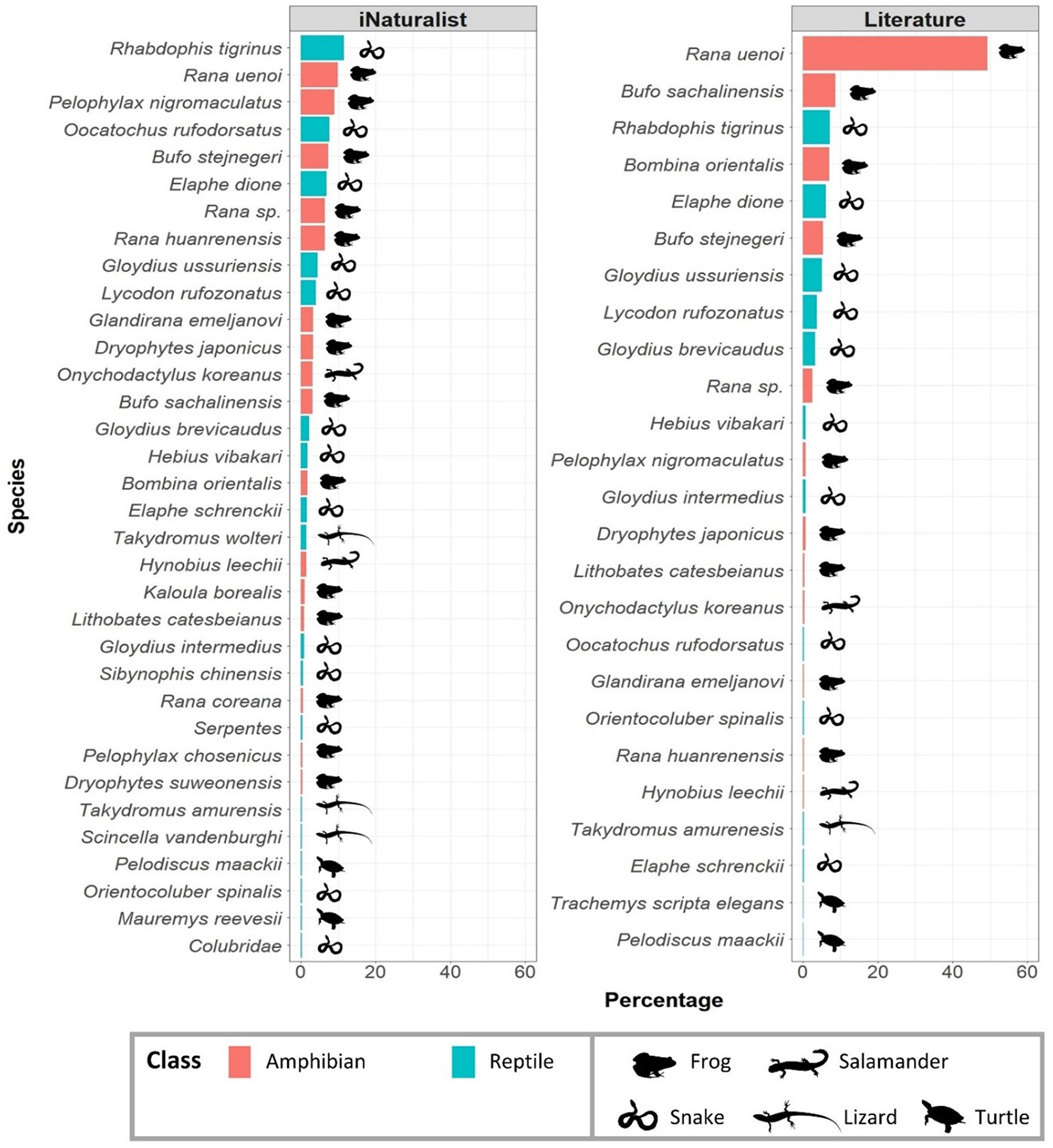 Comparison of the taxonomic composition of roadkill observations between the iNaturalist and literature-based data. Due to the different sample sizes between data types, we converted the raw count of frequency to percentages to apply the same scale of comparison. The most heavily affected species were generally congruent between datasets, with several differences associated with taxonomic diversity detected in each dataset as well as the sampled percentage of each species. Note that the iNaturalist data detected roadkills in more species (n = 32; 76.2% of total herpetofaunal diversity of R Korea) compared to the literature-based data (n = 25; 59.5% of total herpetofaunal diversity of R Korea). The silhouette figures were obtained from PhyloPic (http://phylopic.org/) under the Public Domain Dedication 1.0 license or the Public Domain Mark 1.0 license (for the turtle silhouette). Frog silhouette (Leptodactylus melanonotus) by Jose Carlos Arenas-Monroy; Salamander silhouette (Onychodactylus fischeri) by zoosnow; Snake silhouette (Vipera berus) by Beth Reinke; Lizard silhouette (Eumeces fasciatus) by David Orr; Turtle silhouette (Chrysemys picta) by an uncredited author.