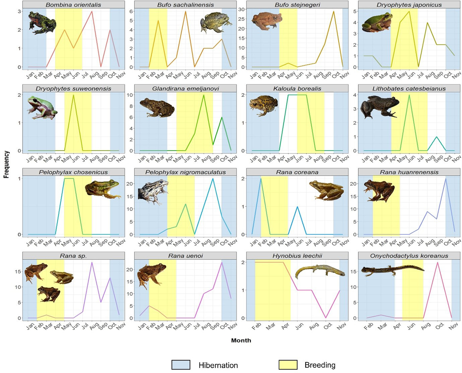 The monthly roadkill trends for Korean amphibians (n = 361), based on iNaturalist observations. The roadkill records were collected from 1 January 2005 to 13 August 2021 through the iNaturalist project “Herpetofauna Roadkill in the Republic of Korea”. Ambiguous observations with identifications above the genus level were excluded. The information on breeding season and hibernation period for each species is based on Lee and Park (2016), and summarized in Supplementary Table 2. Photographs of amphibians by AB.
