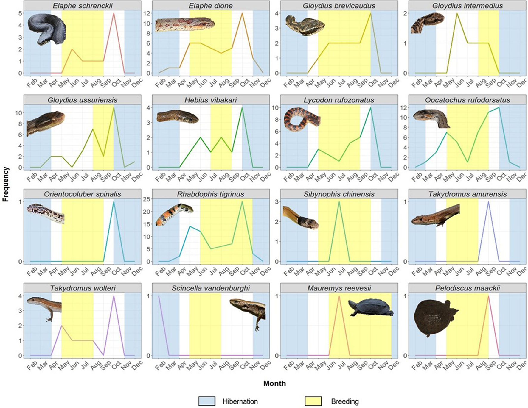 As the iNaturalist observations were not normally distributed, we primarily used chi-square tests to investigate monthly trends in the number of recorded roadkills. We focused on monthly roadkill trends as many reptile and amphibian species show highly seasonal movement patterns (Shepard et al., 2008; Garriga et al., 2017), and since previous studies suggest strong monthly patterns associated with the recorded number of herpetofauna roadkills in R Korea (Song et al., 2009; Park et al., 2017). We analyzed the monthly data at different levels. First, we conducted chi-square tests for each species of amphibians and reptiles and plotted monthly roadkill trends for each species. We then superimposed the known key life-history aspects (e.g., hibernation and breeding seasons) over the monthly roadkill trends to investigate the ability of citizen science-based roadkill trends in capturing ecological signals associated with species life histories. For information on life histories, we primarily consulted the works of Lee et al. (2012) for reptiles, and Lee and Park (2016) for amphibians. For two species of snakes (Sibynophis chinensis and Gloydius intermedius) with limited life histories documented in Lee et al. (2012), we supplemented relevant information derived from recently published studies (Do et al., 2017; Koo et al., 2018; Banjade et al., 2020).