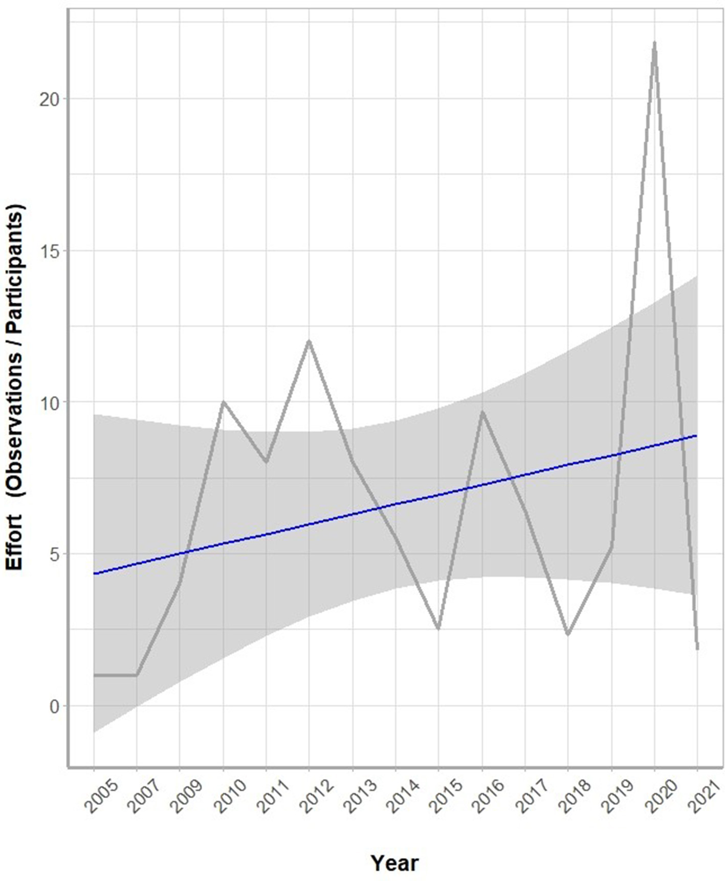 In addition, we plotted the monthly roadkill observations against the total monthly observations of reptiles and amphibians. We conducted this procedure separately for amphibians and reptiles to visualize whether the temporal bias of the total herpetofauna observations was also reflected in the roadkill observations. We matched the time period of total observations to that of the roadkill observations to ensure comparability of data. Finally, we assessed the overall yearly sampling efforts of the iNaturalist dataset through years 2005 to 2021, expressed as the number of observations divided by the number of participants (sensu Chyn et al., 2019). We performed these biostatistical analyses in R version 4.1.0 (R Core Team, 2021), implemented in the RStudio environment.