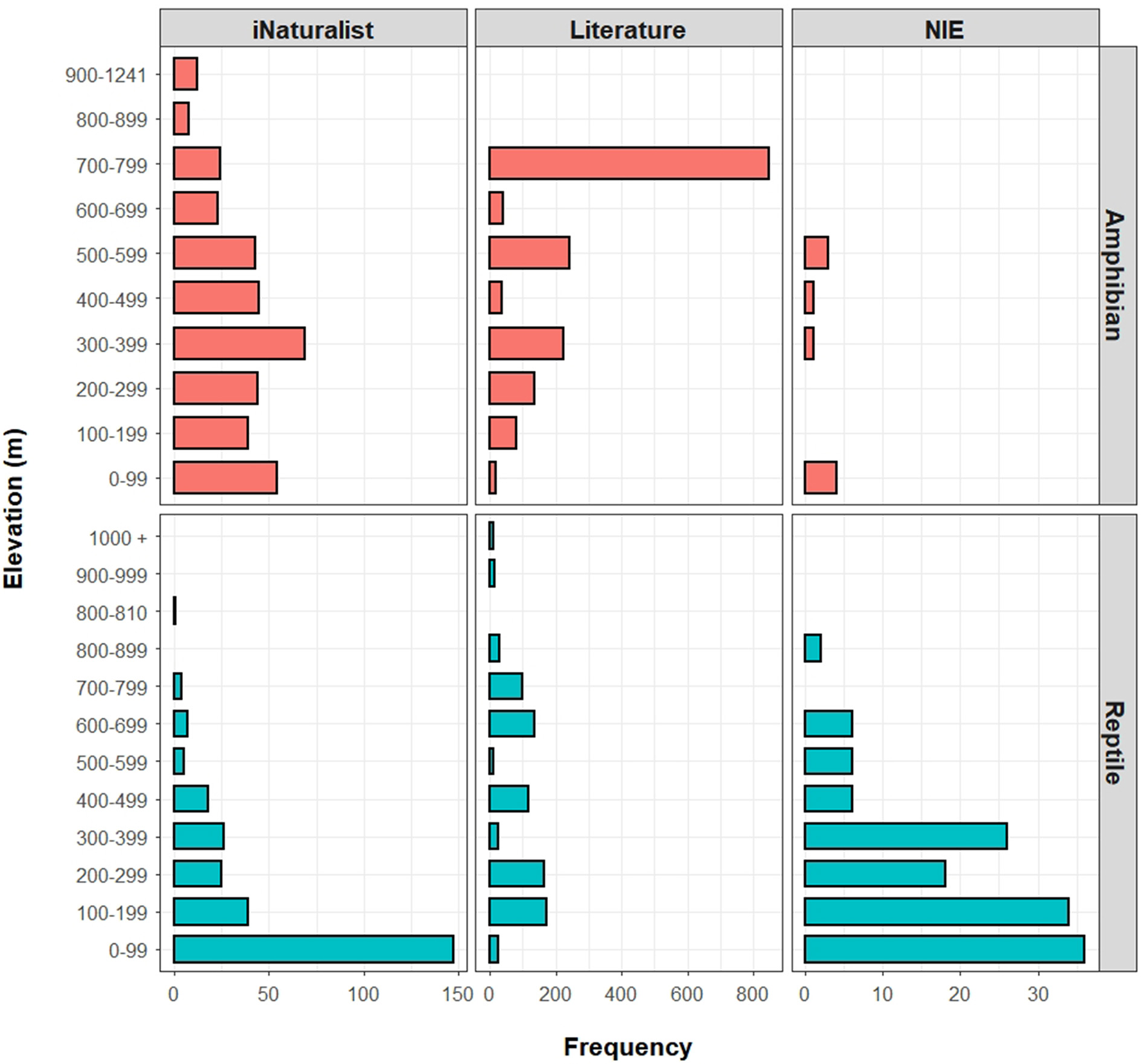 For further comparisons on the spatial aspects of the roadkill occurrences, we utilized another independent dataset generated by the National Institute of Ecology (NIE) in R Korea. The NIE dataset is based on the Korea Roadkill Observation System (KROS) launched in 2018 by the Ministry of Environment and the Ministry of Land, Infrastructure, and Transport (Kim et al., 2019). The roadkill data were recorded between March 2019 and September 2021. The resulting dataset is comprised of GPS coordinates and species-level identification for each roadkill occurrence point. After removing the entries with missing species-level identification, we used the same methods applied to the iNaturalist dataset to categorize elevational ranges and habitat types of the NIE data, separately for amphibians and reptiles. Next, we conducted chi-square tests separately for amphibian and reptile datasets to test for differences in the distribution of NIE roadkill records across habitat types and elevational ranges. As the NIE dataset had a considerably shorter time span compared to both the iNaturalist and literature datasets, we restricted the use of this dataset to the broad-scale comparisons of landscape and elevational aspects only.