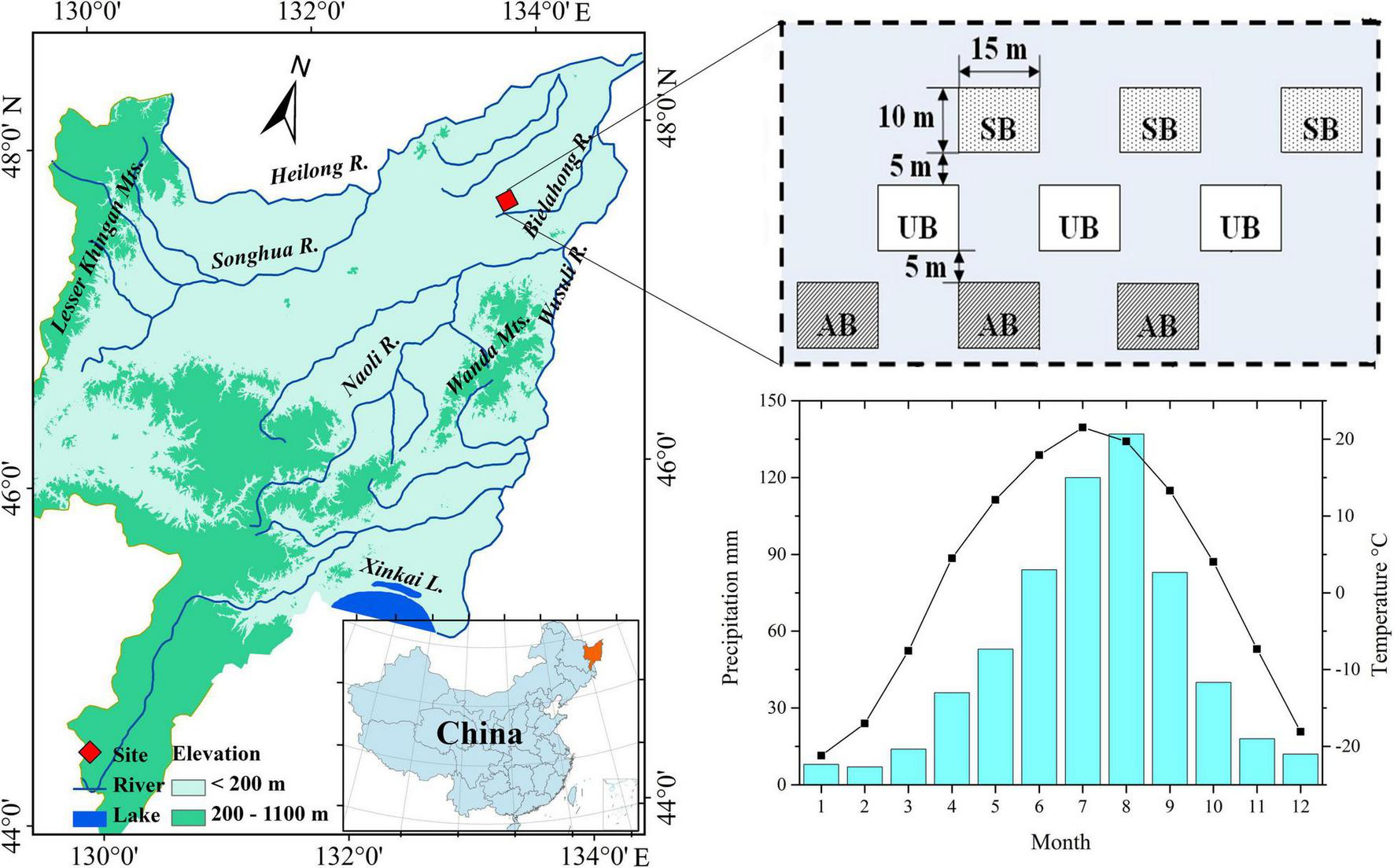 Location of the studied sites (i.e. spring burnt sites, SB; autumn burnt sites, AB; unburnt sites, UB) in Sanjiang Plain, Northeast China (Gao et al., 2021), and the average monthly temperature and precipitation in Sanjiang Plain (Fick and Hijmans, 2017).
