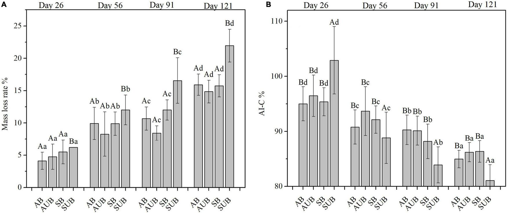 Mass loss (A) and the AI-C (B) in residual plant litters in autumn burnt (AB), autumn unburnt (AUB), spring burnt (SB), and spring unburnt (SUB) sites. Different lowercase letters (a-d) indicate significant differences (Tukey-HSD test) among sampling times and different uppercase letters (A-B) indicate significant differences (Tukey-HSD test) between site types.