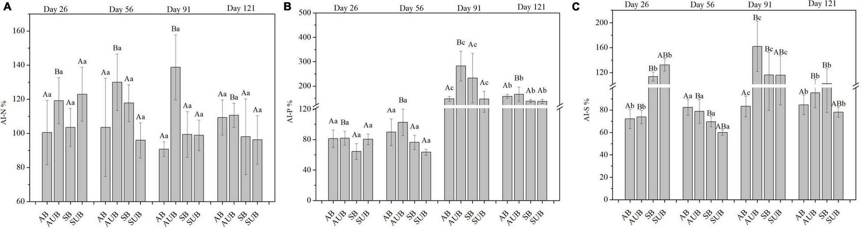 The AI-N (A), AI-P (B), and AI-S (C) in residual plant litters in autumn burnt (AB), autumn unburnt (AUB), spring burnt (SB), and spring unburnt (SUB) sites. Different lowercase letters (a-c) indicate significant differences (Tukey-HSD test) among sampling times and different uppercase letters (A-B) indicate significant differences (Tukey-HSD test) between site types.