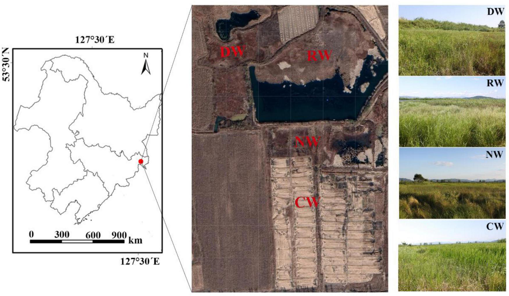 Map of the wetland study sites downstream of the Tumen River. RW, reference wetlands; DW, drained wetlands; NW, nutrient-rich wetlands; CW, cultivated wetlands.