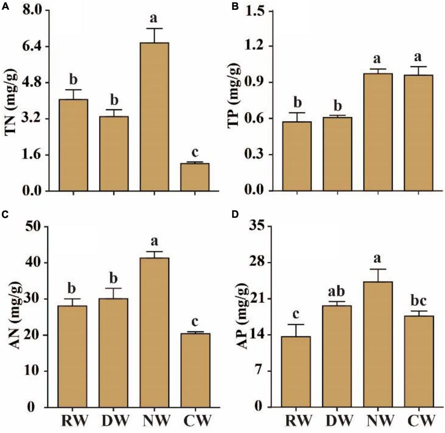 Effects of agricultural intervention on soil properties. (A) Soil total nitrogen (TN); (B) soil total phosphorus (TP); (C) soil available nitrogen (AN); (D) soil available phosphorus (AP). RW, reference wetlands; DW, drained wetlands; NW, nutrient-rich wetlands; CW, cultivated wetlands. Error bars represent ± SE. Different letters indicate significant differences (p < 0.05).