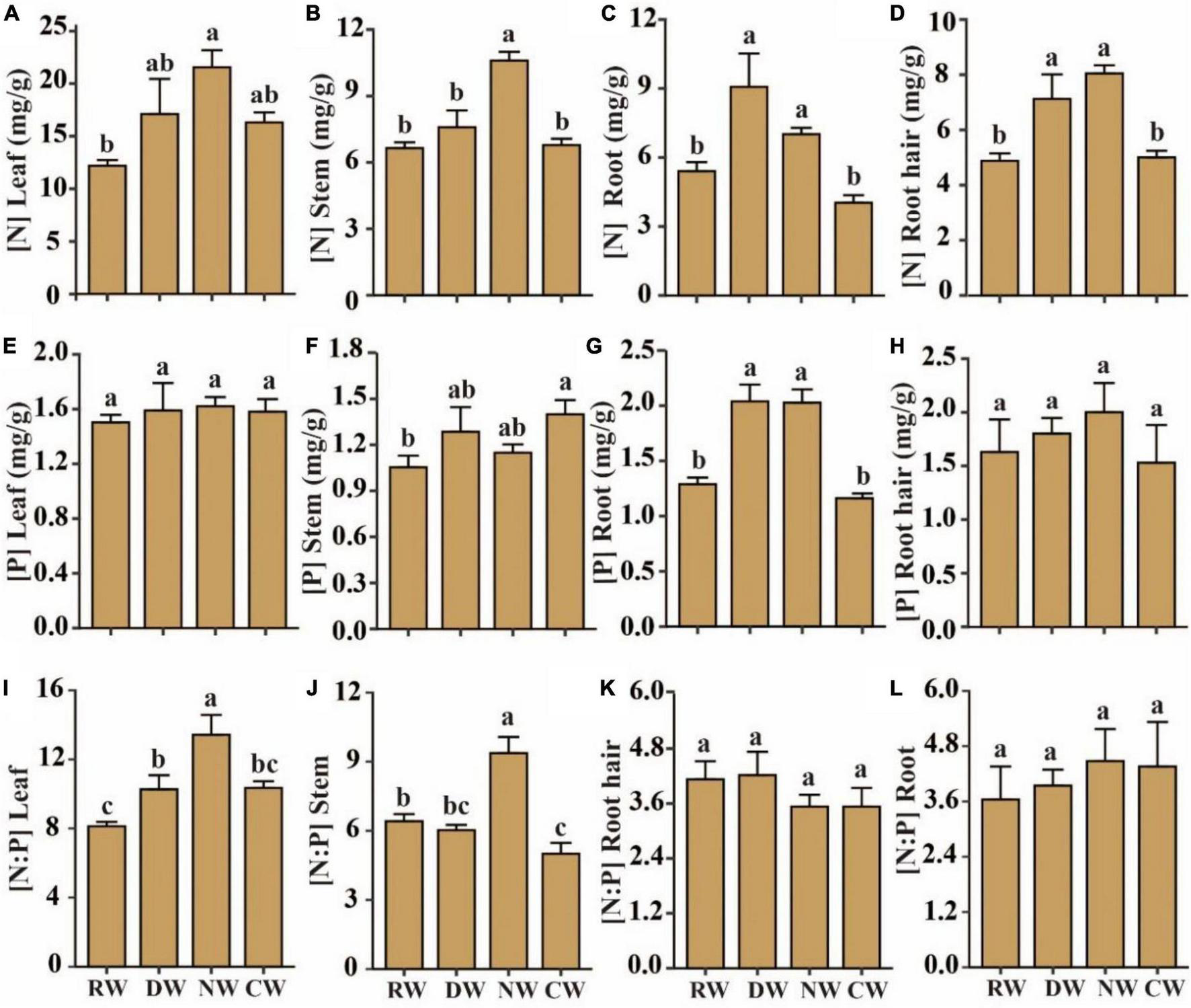 Effects of agricultural intervention on N and P stoichiometry of plant tissues. (A–D) Plant tissue N content; (E–H) plant tissue P content; (I–L) plant tissue N and P stoichiometry. RW, reference wetlands; DW, drained wetlands; NW, nutrient-rich wetlands; CW, cultivated wetlands. Error bars represent ± SE. Different letters indicate significant differences between sites (p < 0.05).