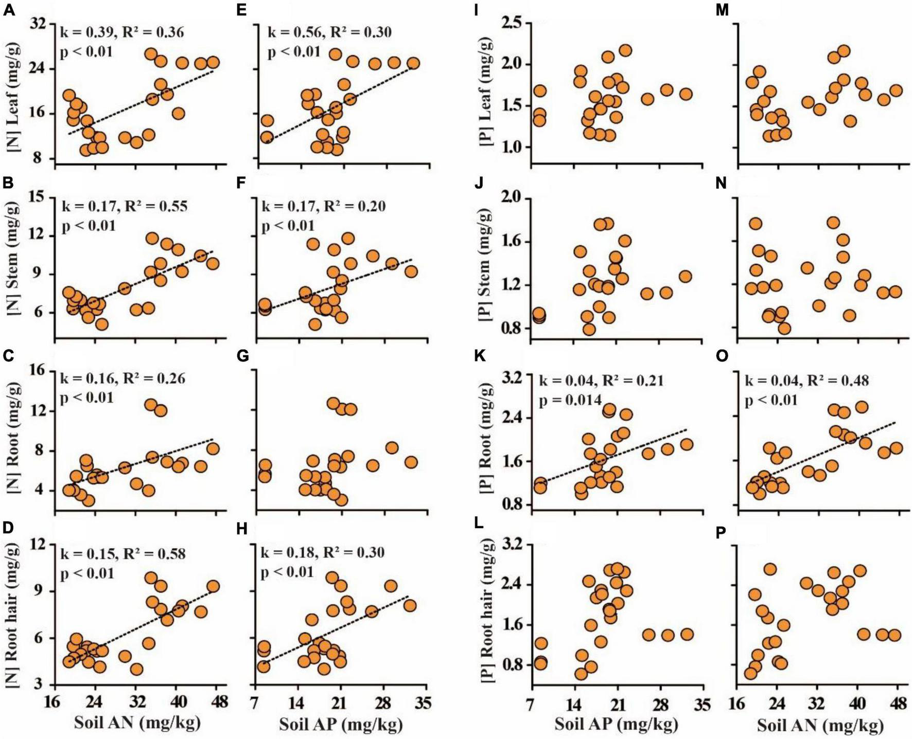 The relationship between soil nutrient availability on the N and P of plant tissues. (A–D) Soil available nitrogen (AN) and plant tissue N; (E–H) soil available phosphorus (AP) and plant tissue P; (I–L) soil AP and plant tissue P; (M–P) soil AN and plant tissue P.