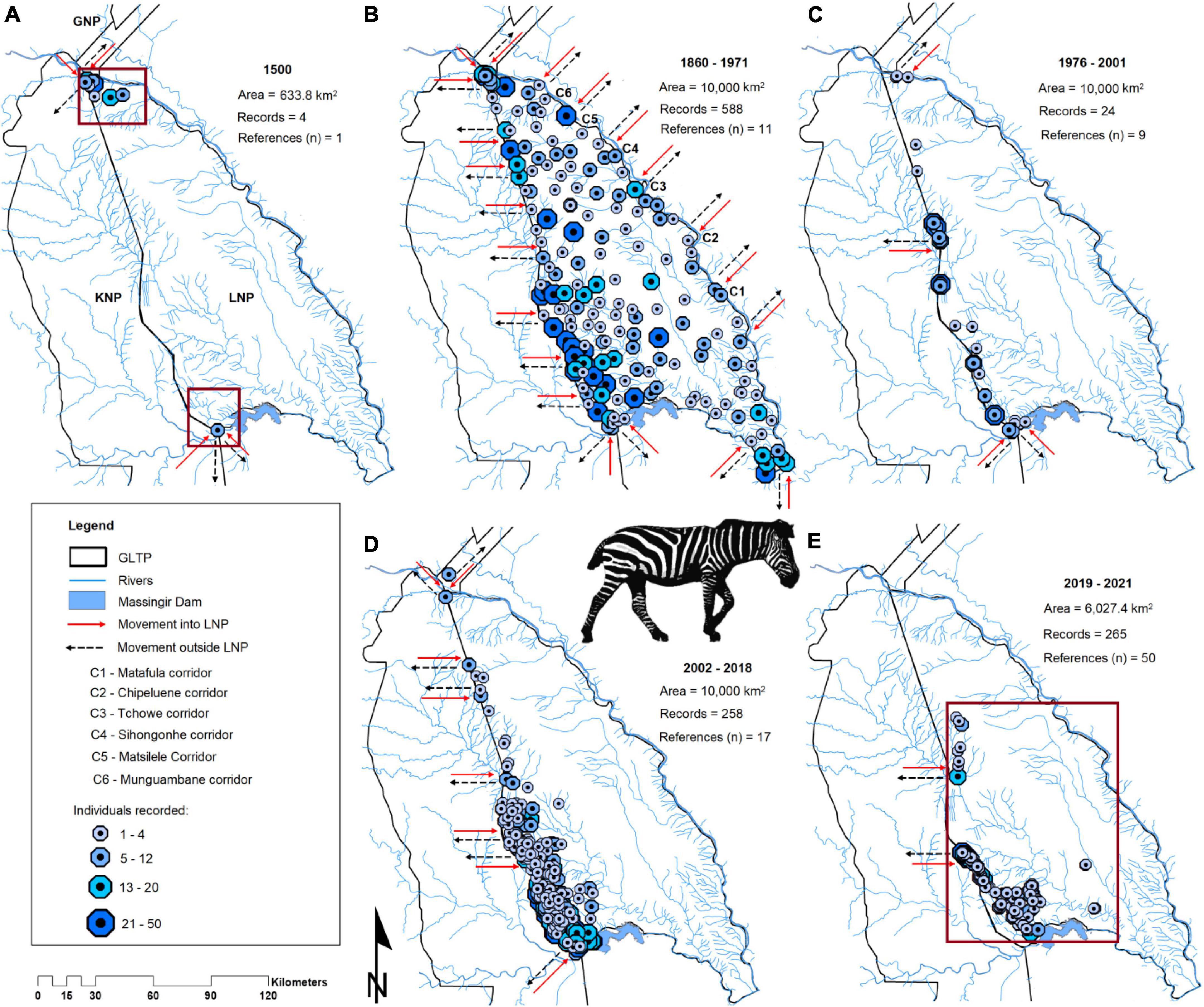 Figure 6. Plain’s zebra distribution and movement patterns in the LNP, (A) prehistoric/start of the colonial period, (B) peak of the colonial period (C) post-colonial/civil war/intense poaching period, (D) proclamation of GLTP period, and (E) current period. The area (km2) represents the spatial covered by the references, the record is the observation of the species and the reference is the species observation source, dark red rectangles represent the area covered by reference in periods (A,E). GLTP, Great Limpopo National Park; GNP, Gonarezhou National Park; KNP, Kruger National Park; LNP, Limpopo National Park.