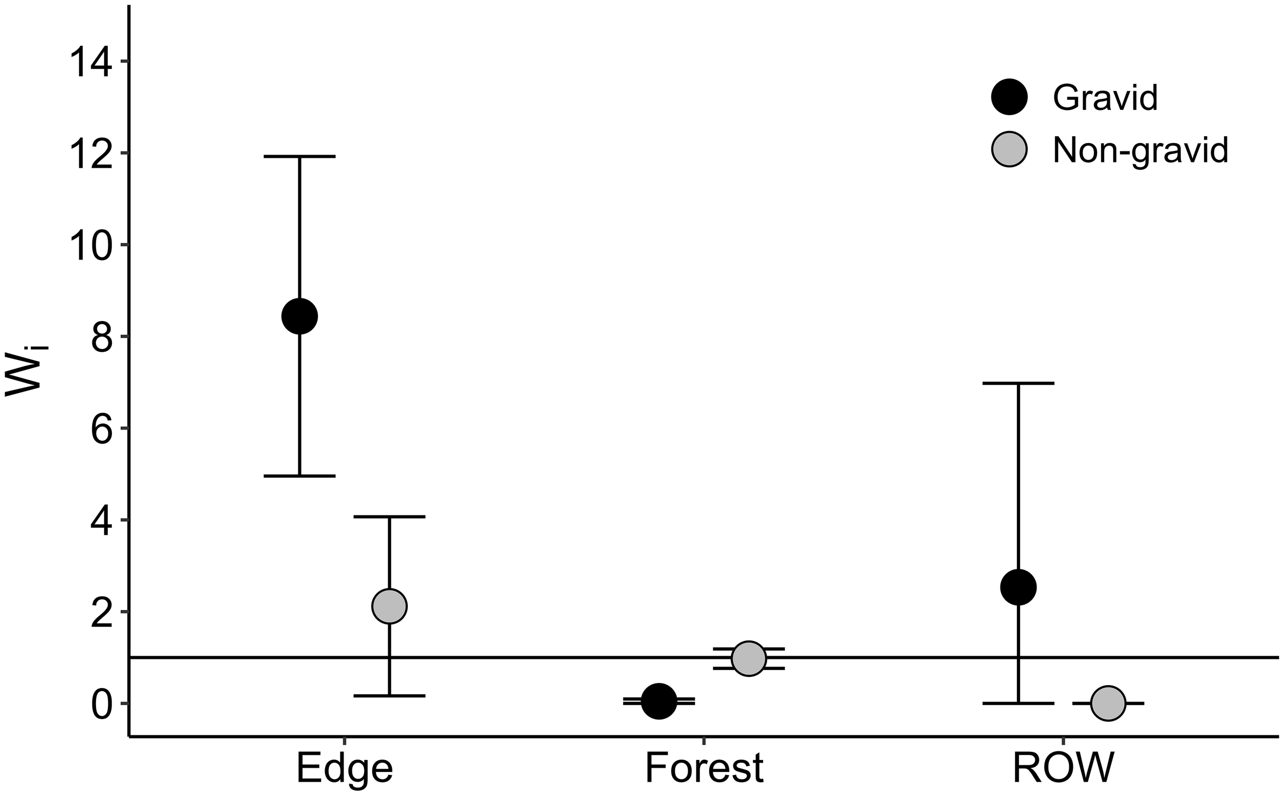 Macrohabitat selection for gravid and non-gravid timber rattlesnakes at the Nelsonville Bypass study site. Manly selection ratios were evaluated under a Type II availability design. α and 95% confidence intervals were adjusted for multiple comparisons. Wi are selection ratio coefficients, where Wi > 1 suggests positive selection for habitat i and Wi < 1 suggests avoidance of a habitat i. The horizontal line through 1 represents the expected usage of habitat i based on its availability (i.e., expected use), and thus confidence intervals overlapping 1 suggest that habitat usage was not statistically different from expected based on its availability.