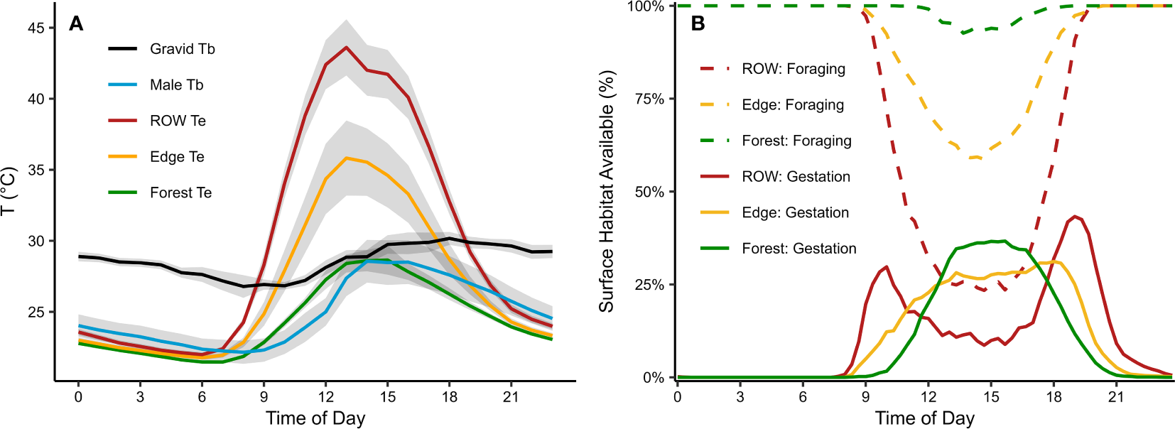 Mean operative temperature conditions and surface availability of suitable thermal habitats at the Nelsonville Bypass. (A) Mean operative temperatures (Te) within each macrohabitat along with the mean hourly body temperatures (Tb) from a gravid female and an adult male timber rattlesnake; gray ribbons are 95% confidence intervals. To allow for comparison between curves, Te and Tb data were summarized across a common range of dates during the warmest period of the summer (August 2, 2016 to August 17, 2016). (B) Surface availability of habitat areas at the Nelsonville Bypass based on suitable temperatures for gestation or foraging. Surface availability for gestation was defined as the percent of operative temperature models where Te was between 27.9 and 31.5°C. Surface availability of foraging habitat was defined as the percent of operative temperature models where Te ≤ 34.0°C.