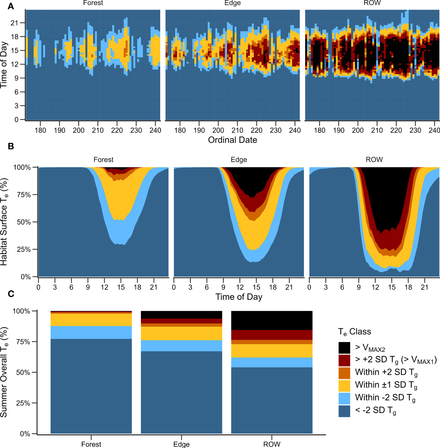 Spatiotemporal availability of thermal resources across habitats at the Nelsonville Bypass. Te classes are in relation to field preferred gestation Tb (29.7°C, SD = ± 1.8°C), and the observed voluntary maximum Tb (VMAX2 = 39.8°C). (A) Median Te class available within each habitat for 20-minute intervals from June 21–August 29, 2016. (B) Proportion of habitat (OTMs) available within each Te class across 20-minute intervals for each habitat across the summer. (C) Overall proportion of time each habitat experienced a given Te class across the summer. Te Classes are described in Supplementary Table 5.
